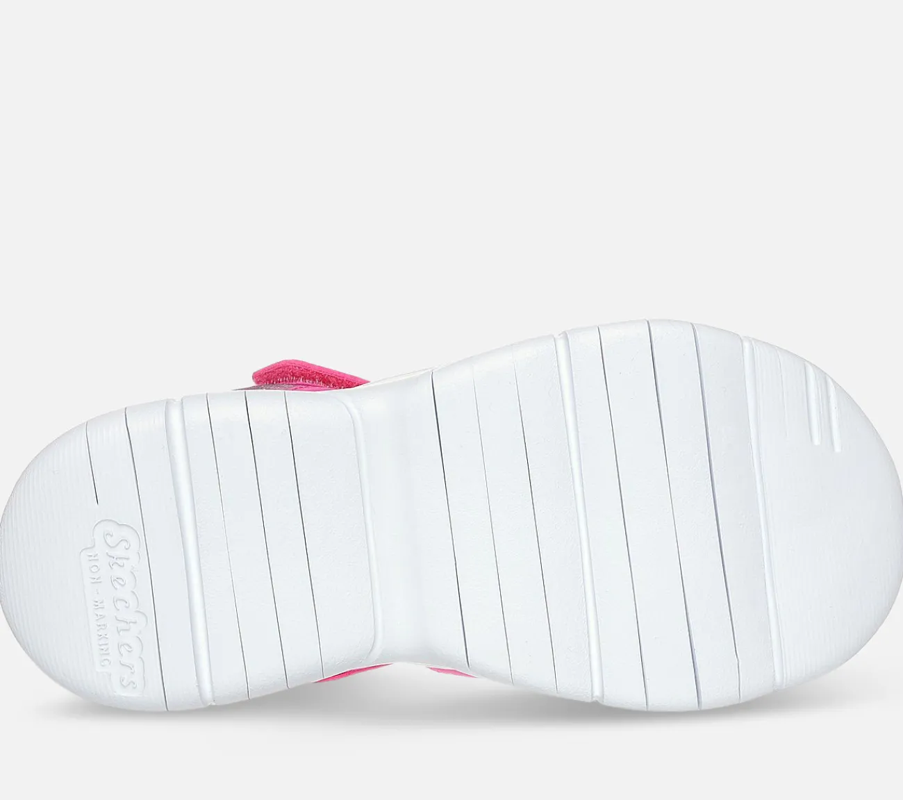 Hav det sjovt hele dagen under solen med Skechers Flex Splash – Daylight Shimmer. Denne lukket-tå sandal har en ombre-glitter syntetisk overdel med stretch-snørebånd, Skechers Adaptive Closure og en polstret komfort-indersål.