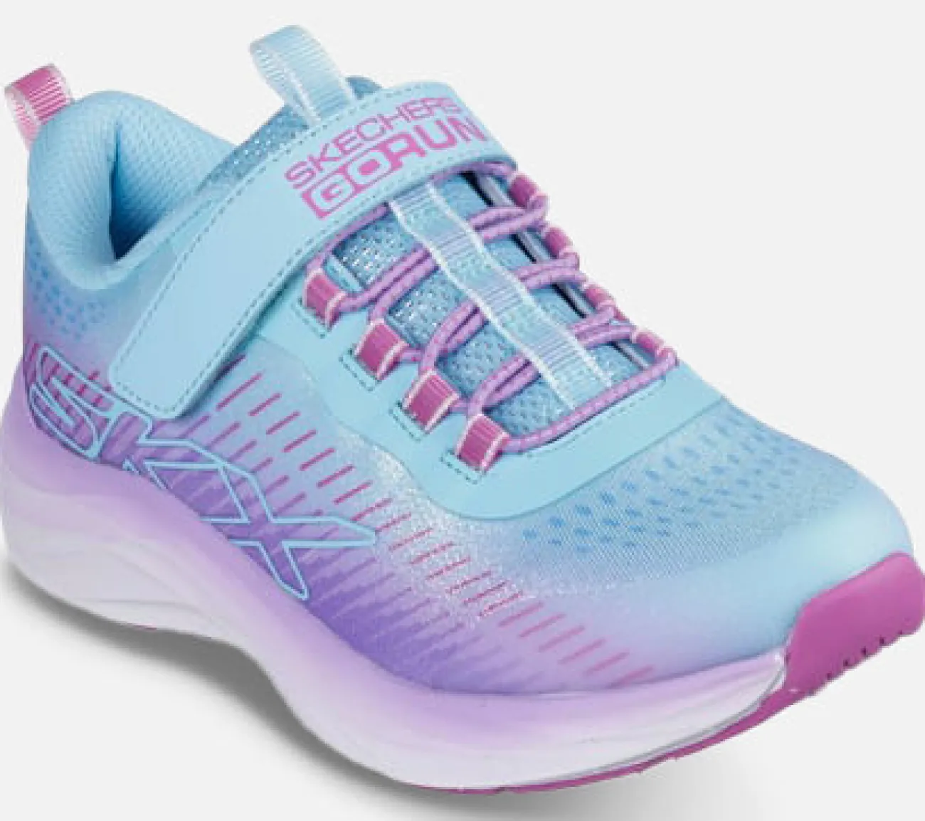 Bevæg dig med afslappet komfort i Skechers GO-RUN®-Accelerate – Glitter Soul. Dette letvægts træningsdesign har en overdel af ombré-netstof med glitter, stræksnører og en polstret Skechers Air-Cooled Goga Mat-indersål.