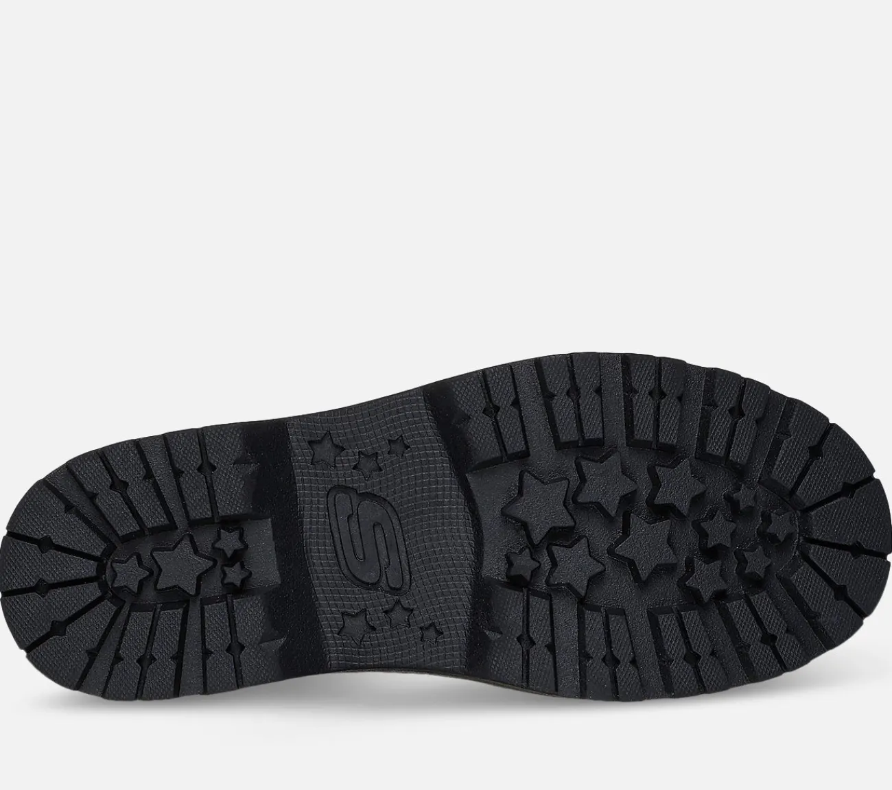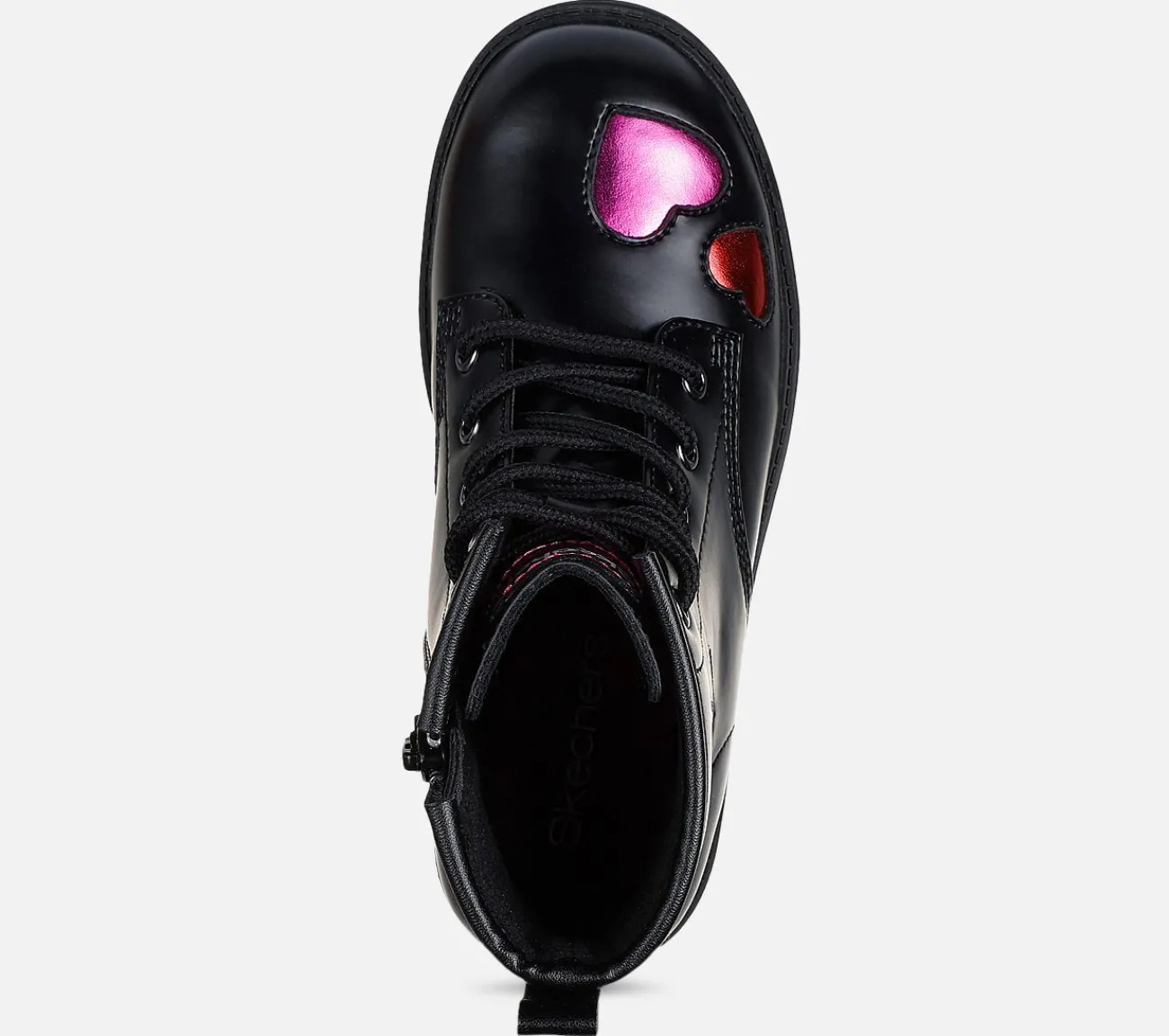 Se super sej ud med Skechers Gravlen Hi – Metallic Heart. Denne støvle er udsmykket med udskårne, metalliske hjerter og har en glat overdel i kunstlæder, lynlås på siden og en robust platform mellemsål.