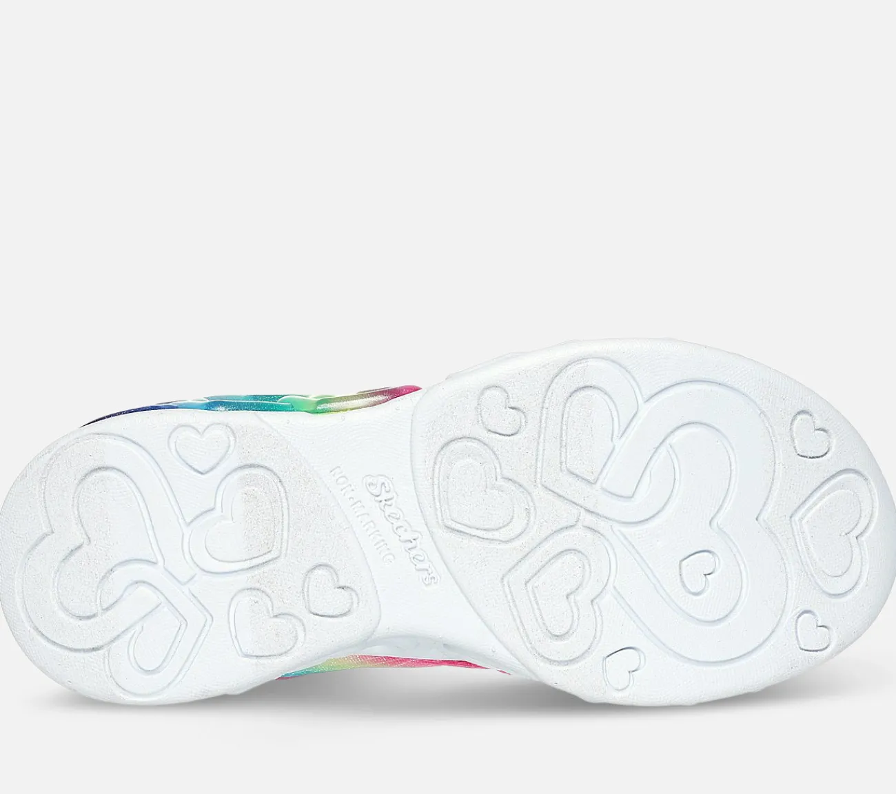 Glitr og strål i magisk glæde med Skechers Hands Free Slip-ins® Heart Lights®: Infinite Heart Lights. Denne Slip-ins® med lysende design har vores eksklusive Heel Pillow™, en mesh-overdel med hjerteprint i ombre og syntetiske glitterdetaljer, faste elastiske snørebånd og en formet midtersål med lys og ‘hjertekæde’ detalje.