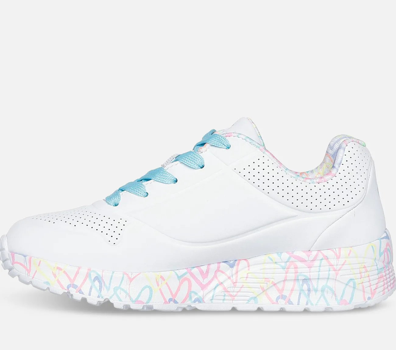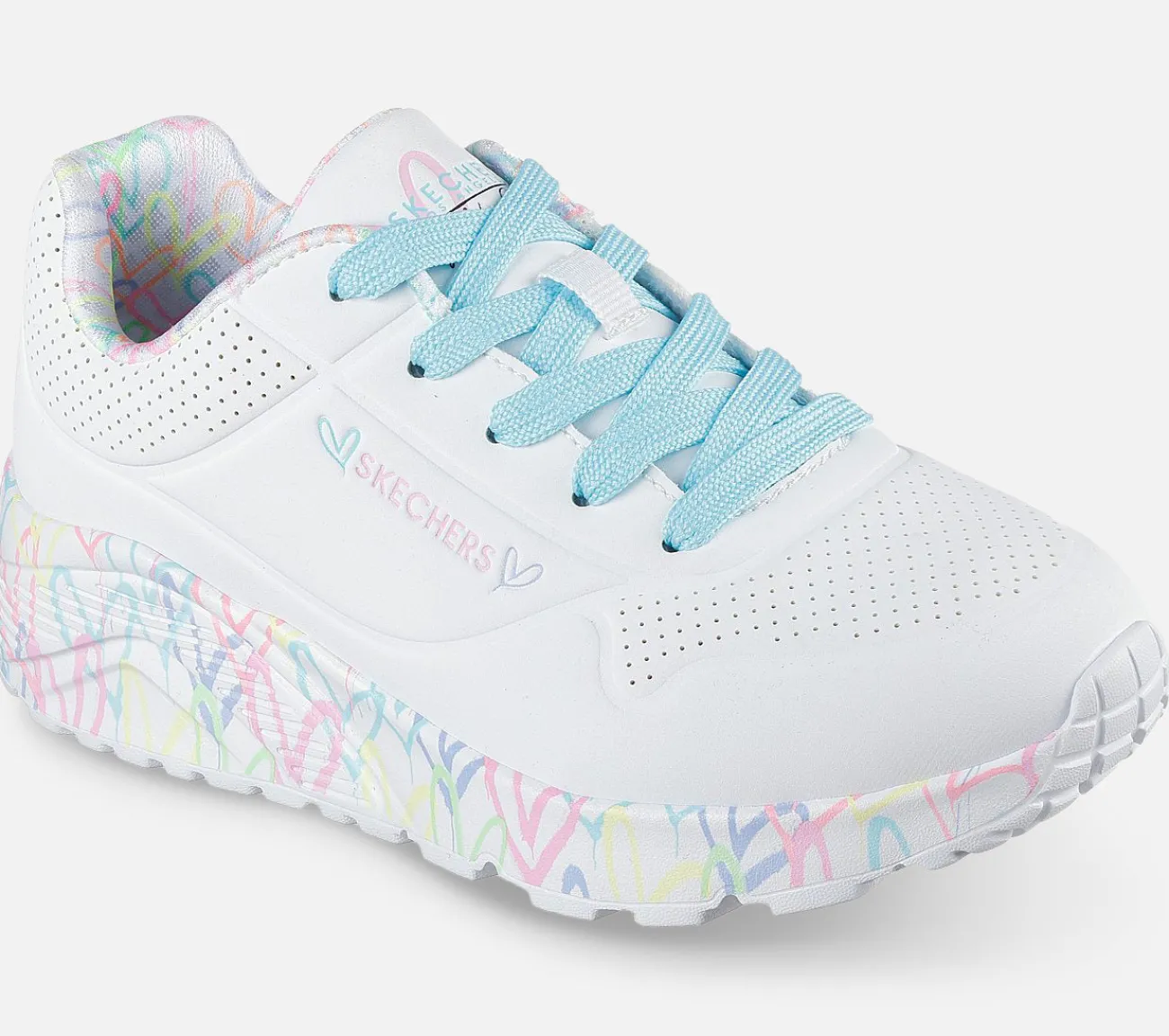 Den internationalt anerkendte muralist James Goldcrown bringer sine ikoniske #Lovewall hjerte designs til Skechers i dette inspirerende samarbejde. Sød og farverig stil mødes i Skechers x JGoldcrown: Skechers Street Uno Lite – Lovely Luv. Denne snøre sneaker har kunstnerens signatur hjerte design på mellemsålen, syntetisk durabuck og perforeret trimmet overdel med en Skechers Air-Cooled Memory Foam indersål.