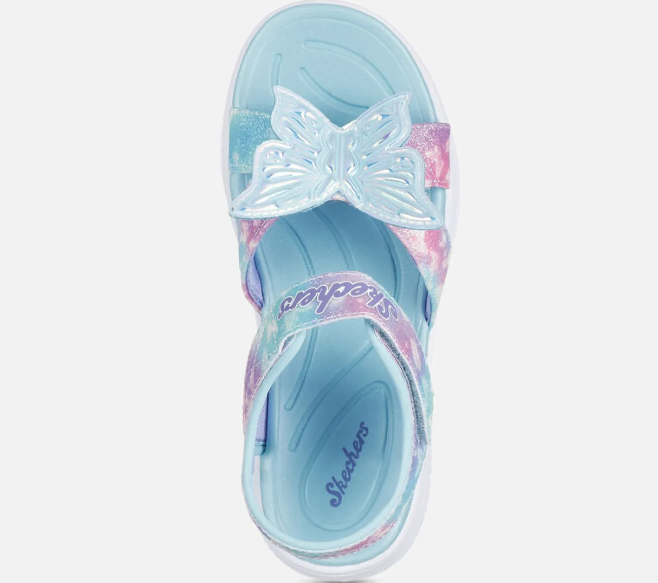Oplys deres skridt i flagrende stil med Skechers Jumpsters Sandal – Butterfly Brights. Dette lysende sommerfugledesign har en glitrende syntetisk stropoverdel med Skechers’ adaptive lukning, samt en polstret komfortindersål.