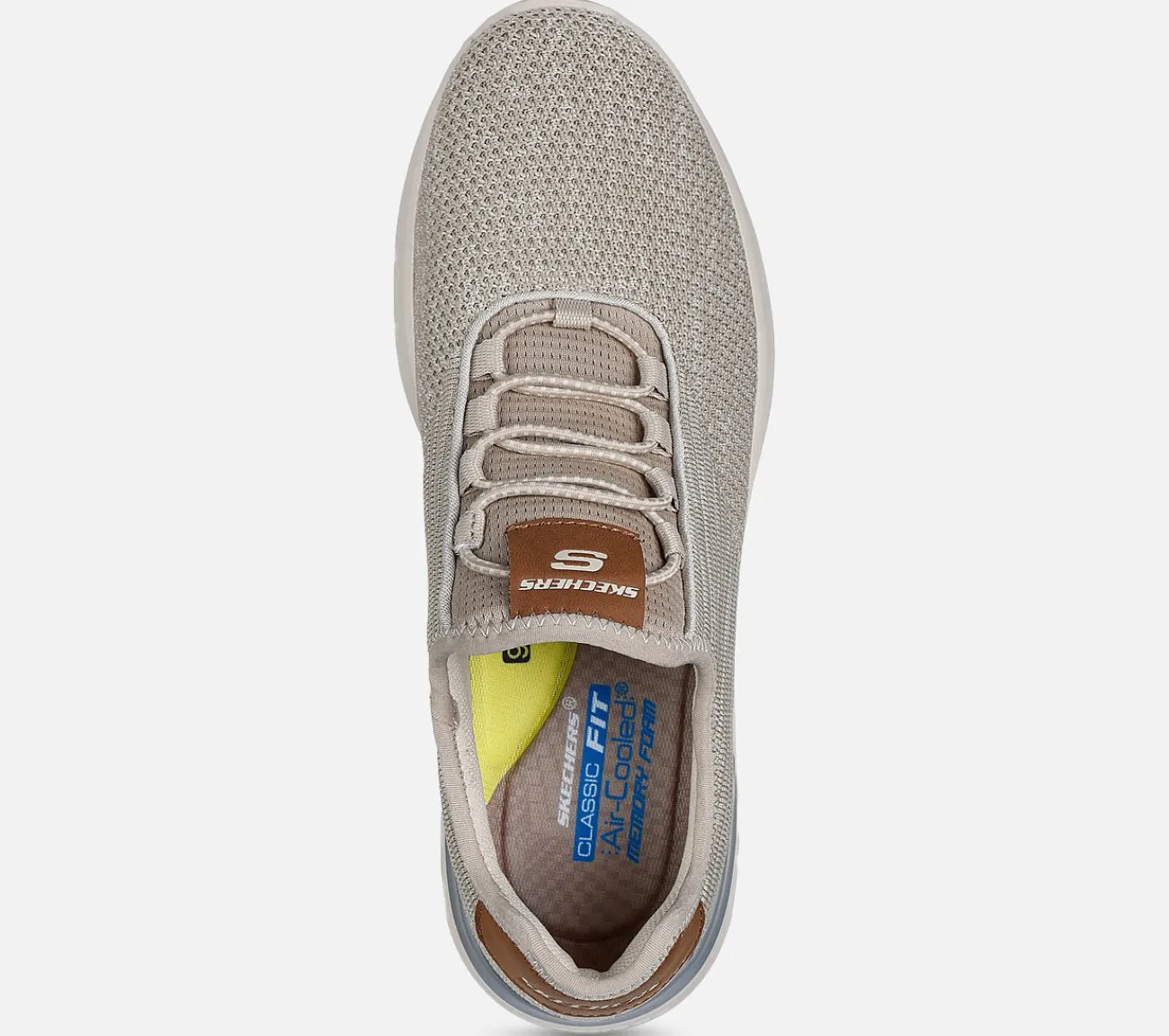 Komfort og sporty, slankt design forenes i Skechers Lattimore – Coringa. Denne Classic Fit slip-on sko har en overdel i mesh-strik med en polstret Skechers Air-Cooled Memory Foam indersål og Skechers Goga Mat Arch for ekstra støtte.