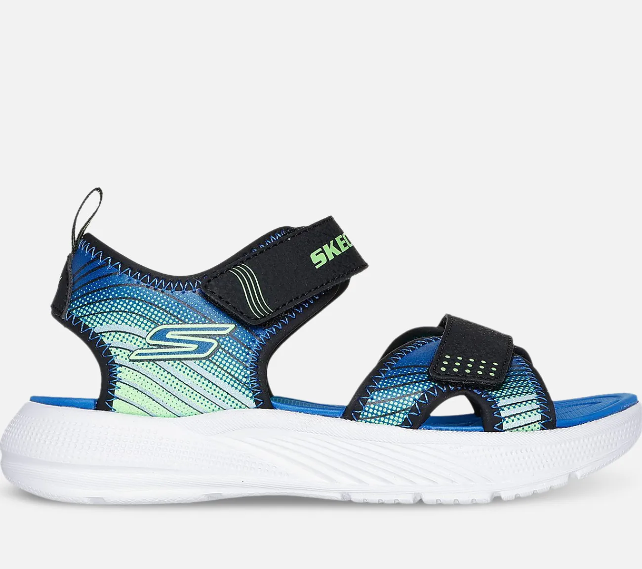 Se sej ud i illumineret stil med Skechers Microspec-Splash. Denne letvægts sportssandal har en syntetisk overdel, Skechers’ adaptive lukning og en polstret komfortindersål.