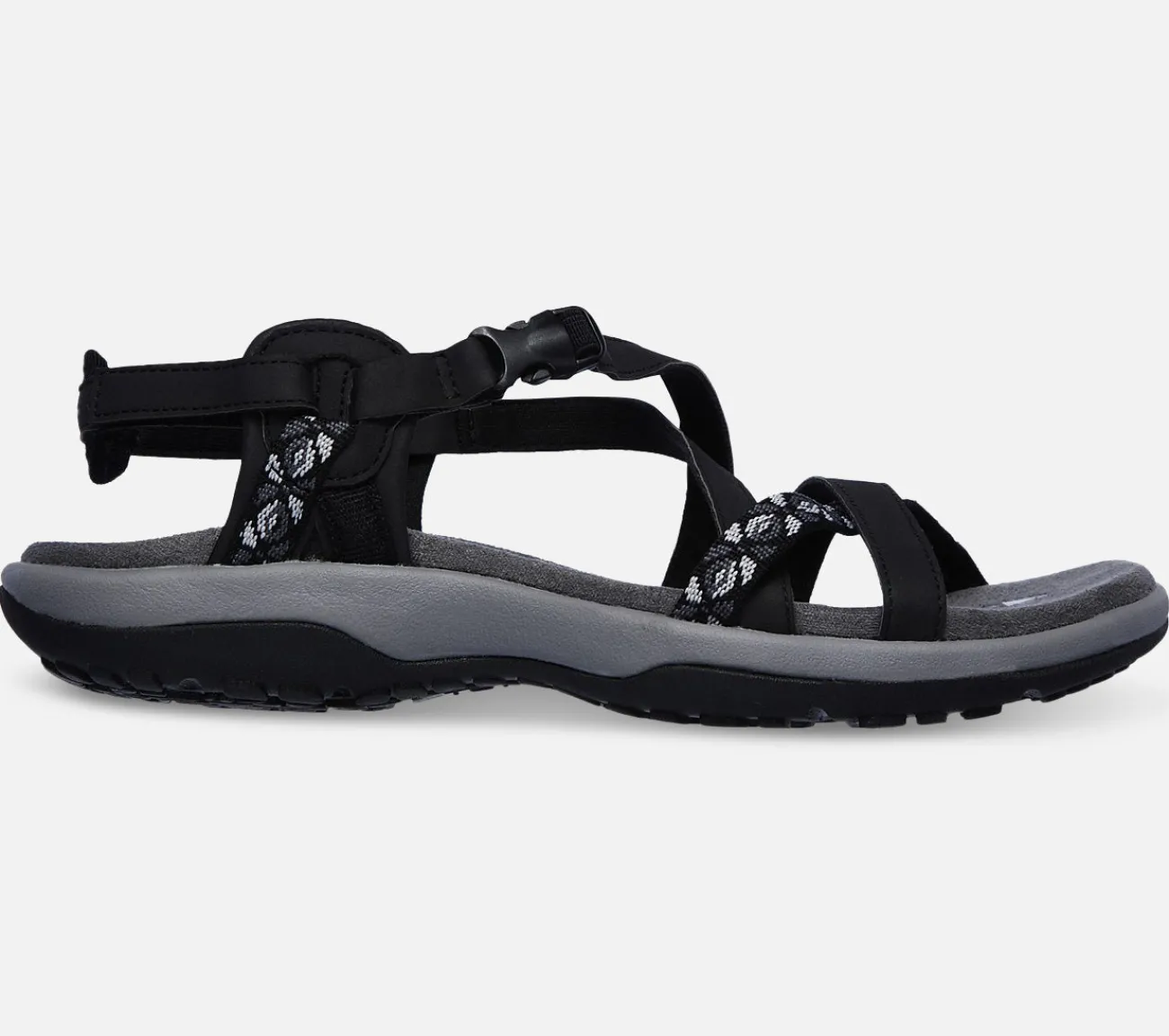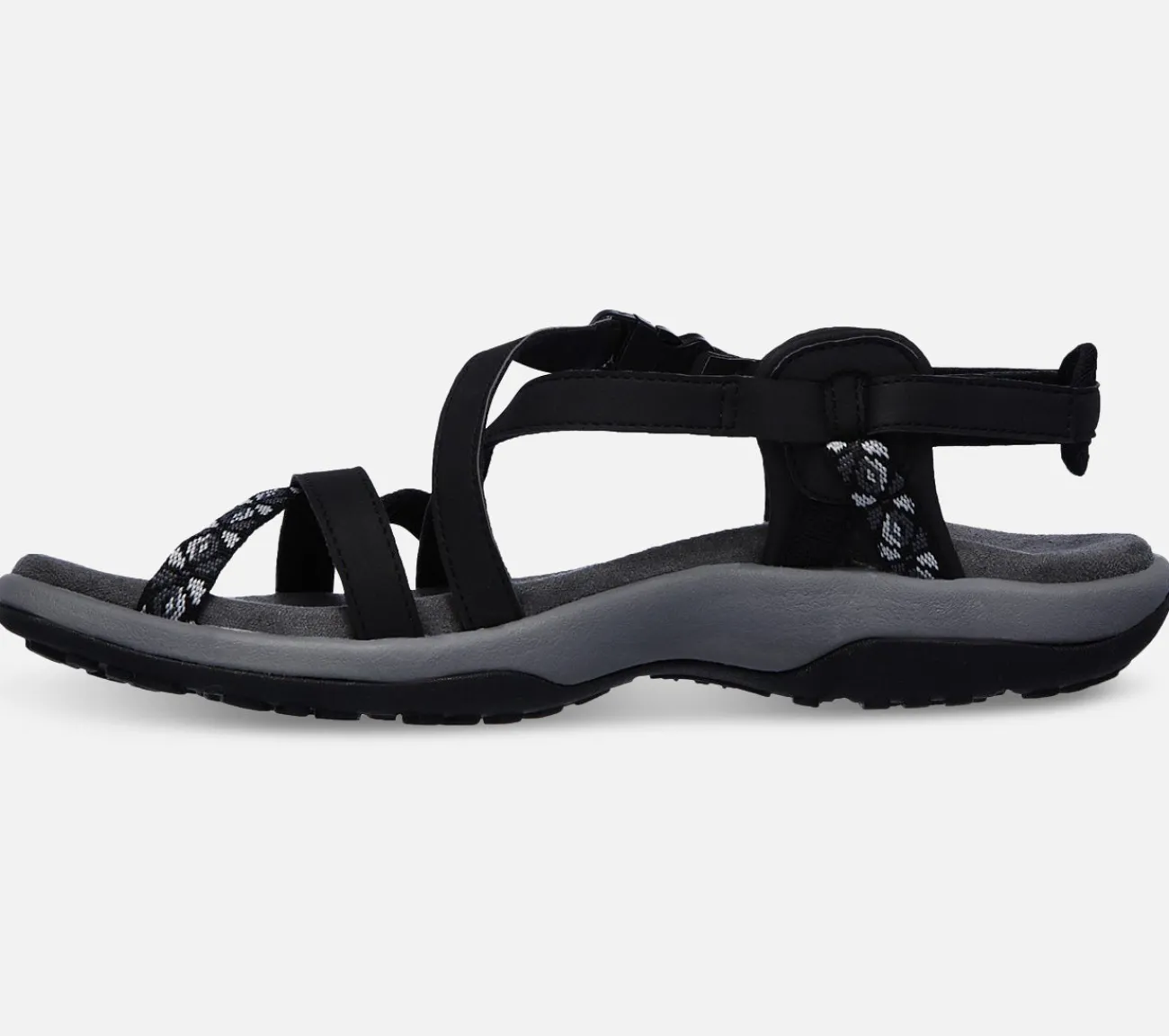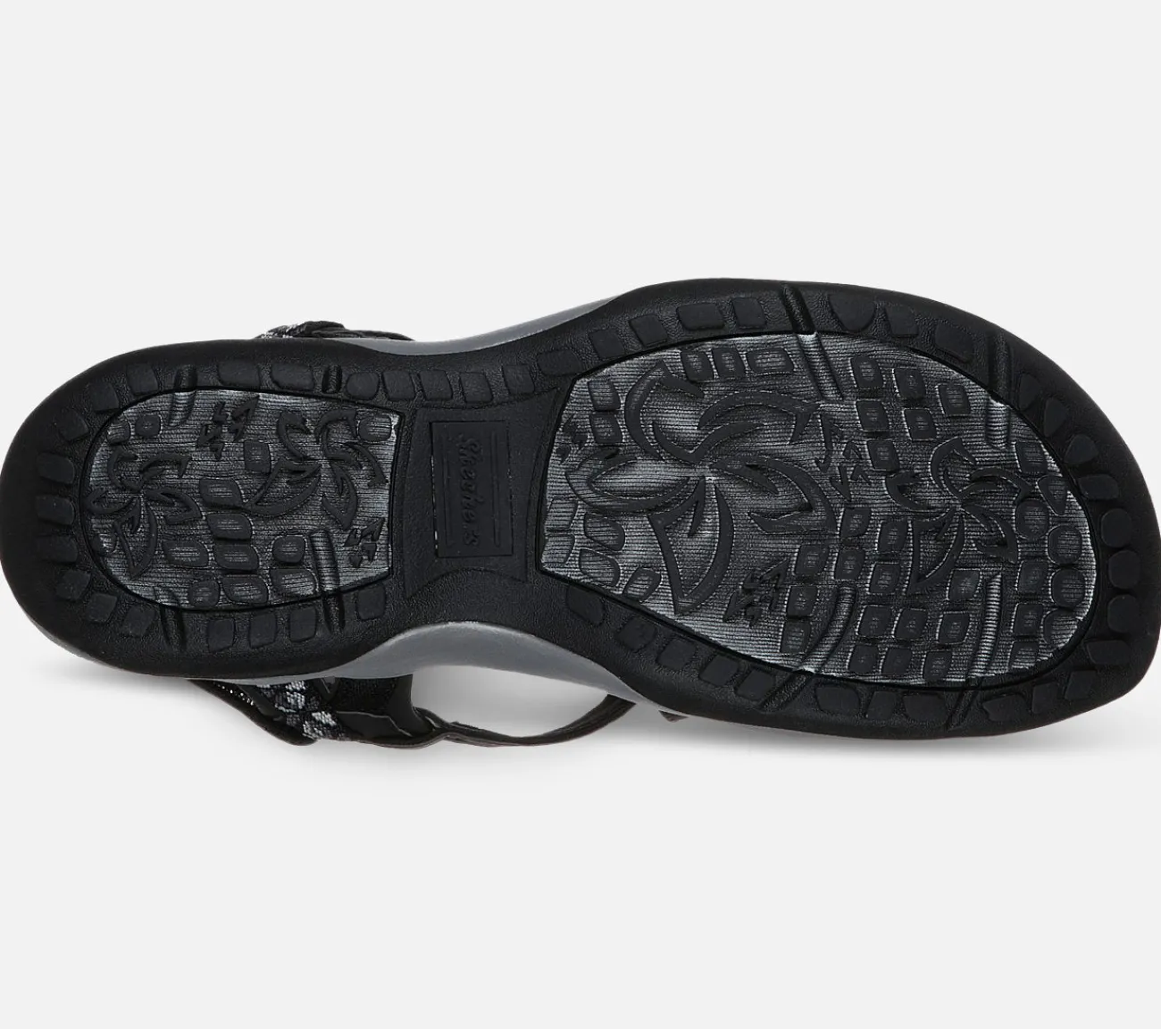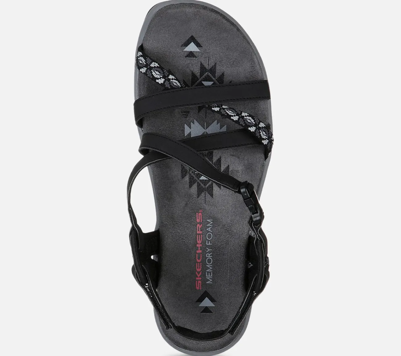 Tag et skridt i afslappet stil og komfort med Skechers Reggae Slim – Vacay. Denne veganske riversandal har en syntetisk og vævet stofoverdel med broderidetaljer, tre justerbare remme og en polstret Skechers Memory Foam indersål.