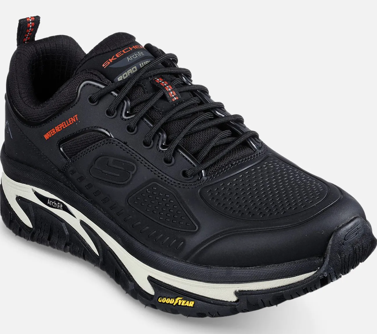 Udforsk nye steder i langvarig støttende komfort med Skechers Relaxed Fit: Arch Fit Road Walker – Recon. Dette udendørs trail-design har en snørelukning og en vandafvisende læderoverdel med en udtagelig Arch Fit indersål og en Goodyear Performance ydersål.