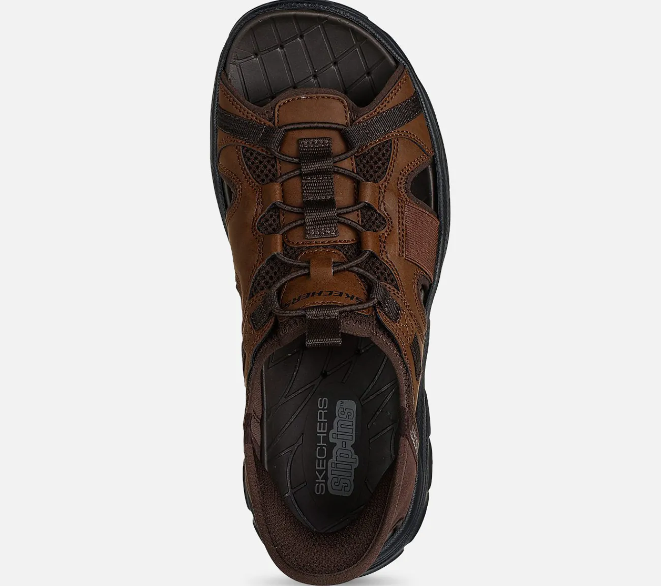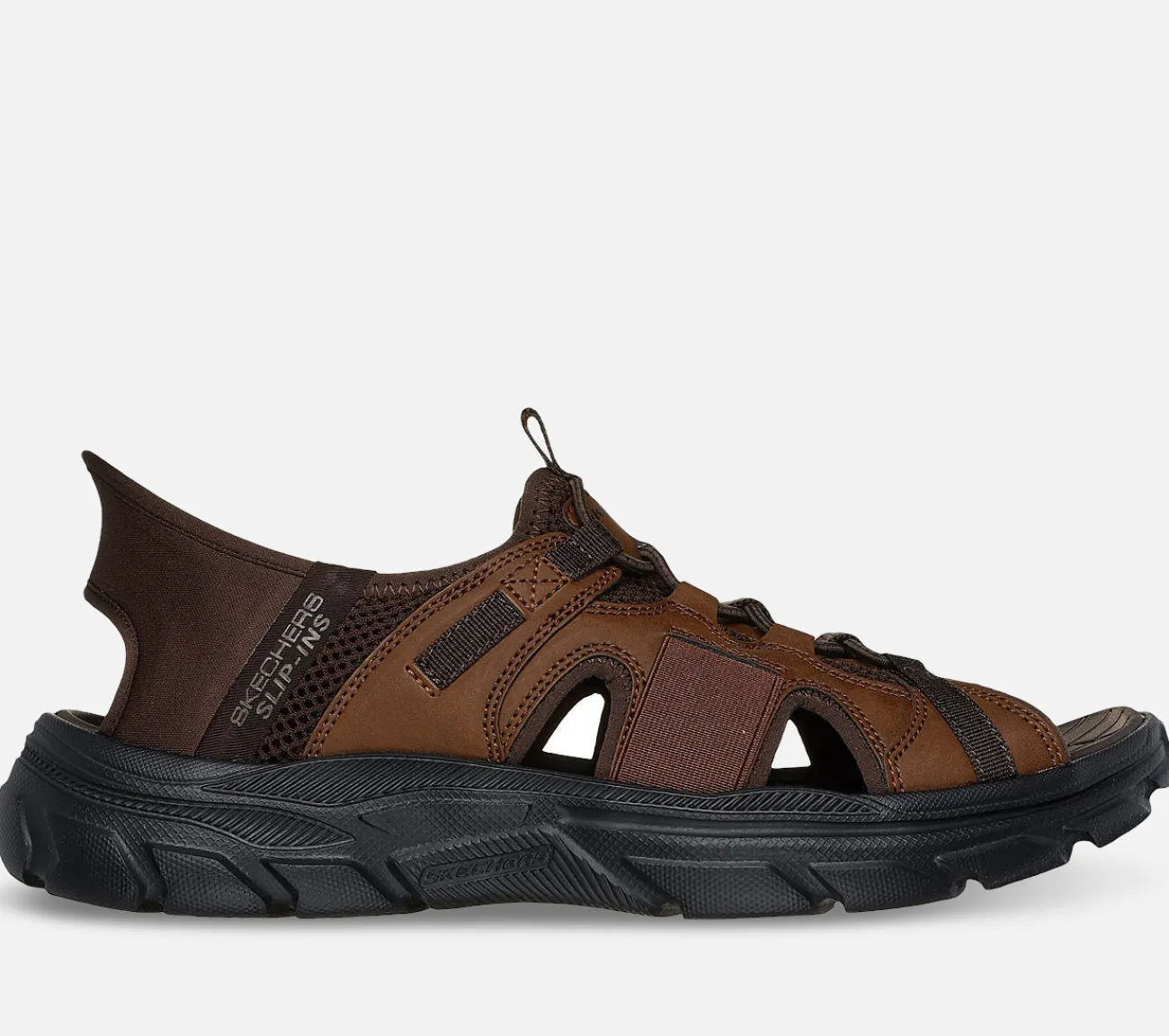 Nyd lange gåture med støttende komfort med Skechers Hands Free Slip-ins® Relaxed Fit®: Revolted – Merrick. Denne sandal i fiskerstil er designet med vores Heel Pillow™ og har en overdel af syntetisk materiale og stræksnører, bagstykke om hælen og en polstret komfortindersål.