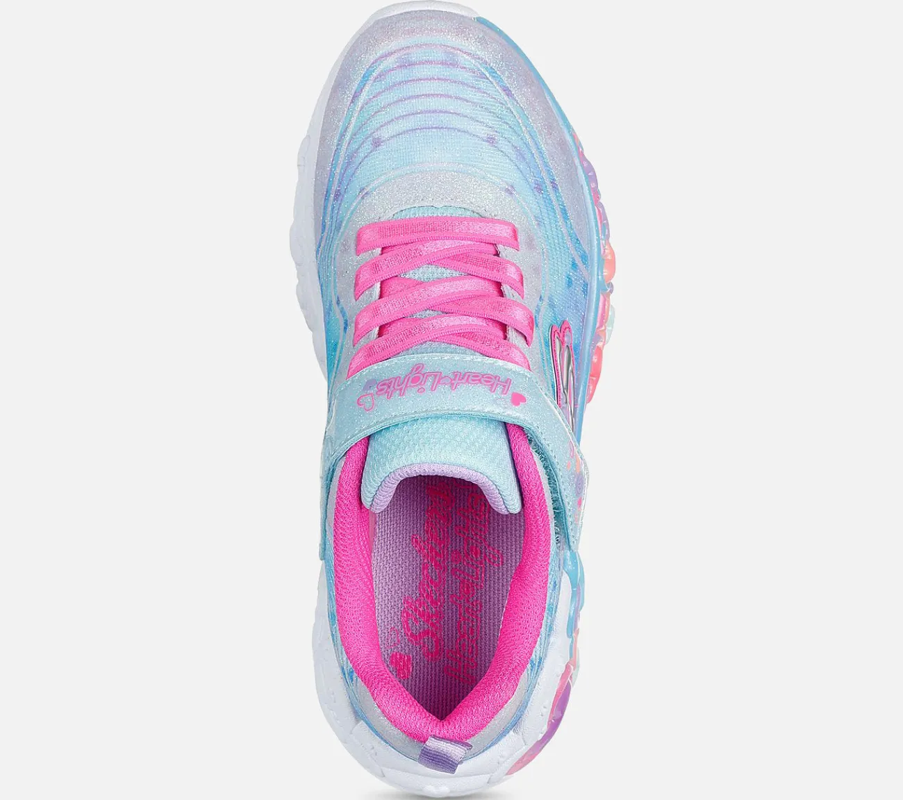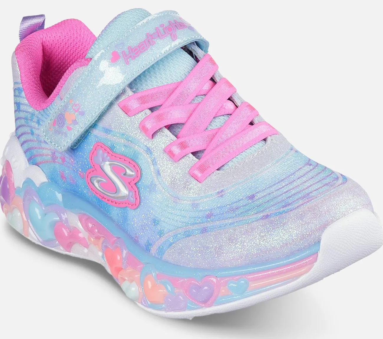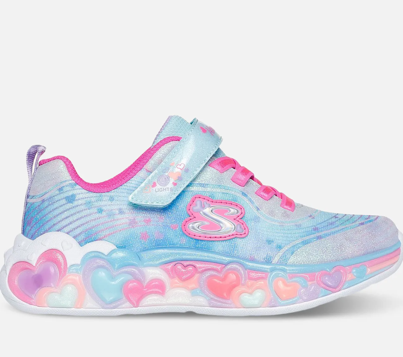 Sporty stil med lys og charme med Skechers S-Lights: Eternal Heart Lights. Denne blinkesko har en glitrende mesh- og syntetisk glitteroverdel, elastisk snørebånd og Skechers Adaptive Closure for nem tilpasning.