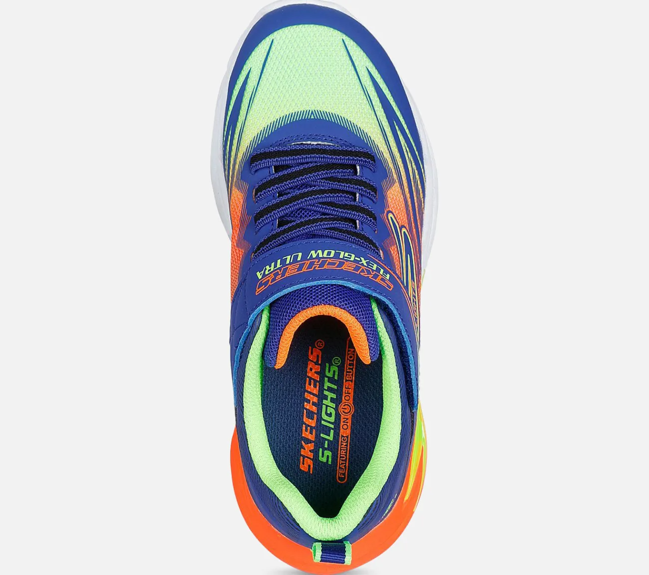 Giv deres dag et ekstra boost med Skechers S-Lights: Flex-Glow Ultra. Denne farverige sneaker har en ombre mesh-overdel med syntetiske detaljer, faste elastiske snørebånd, Skechers Adaptive Closure og en teknisk designet lysende mellemsål.