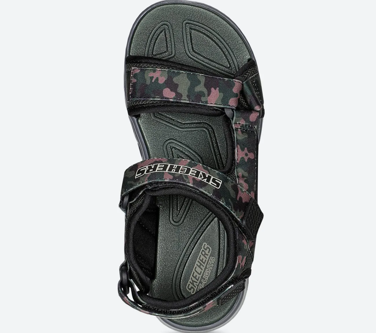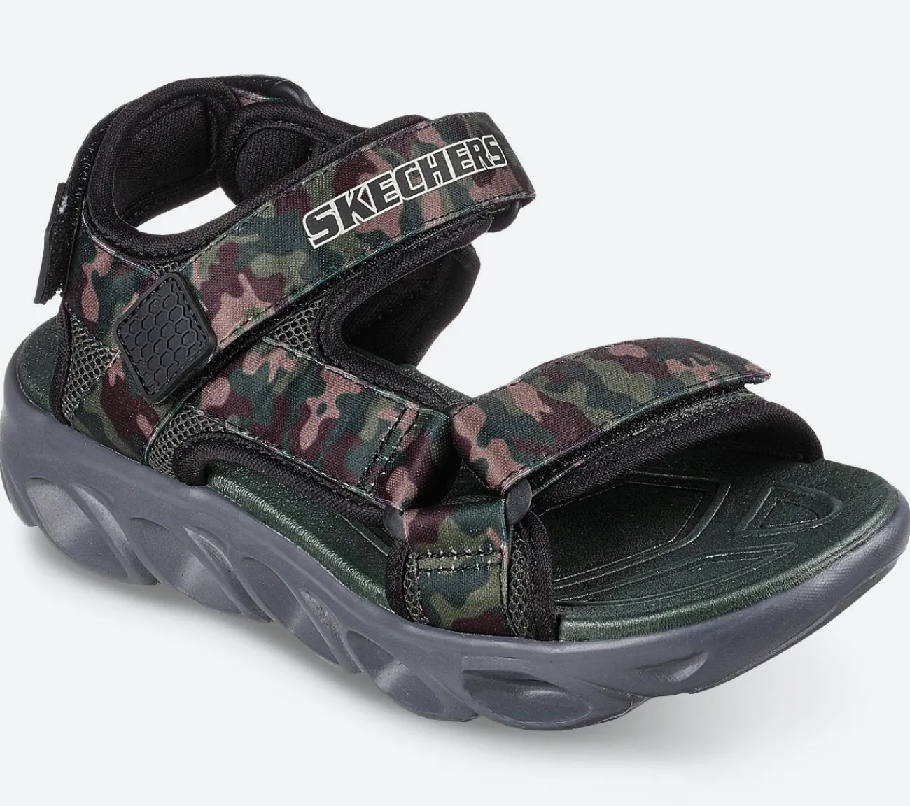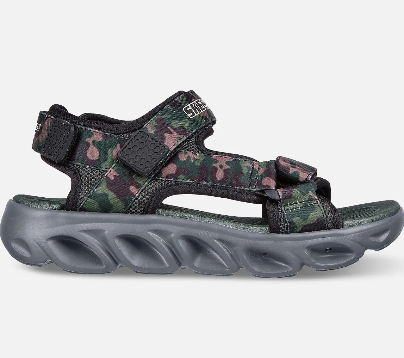 Sjov og solrige dage med Skechers¸ S Lights¸: Hypno-Splash – Sun Breaks. Denne sporty sandal har camouflage printet tekstil overdel med velcrolukninger og lys i mellemsålen