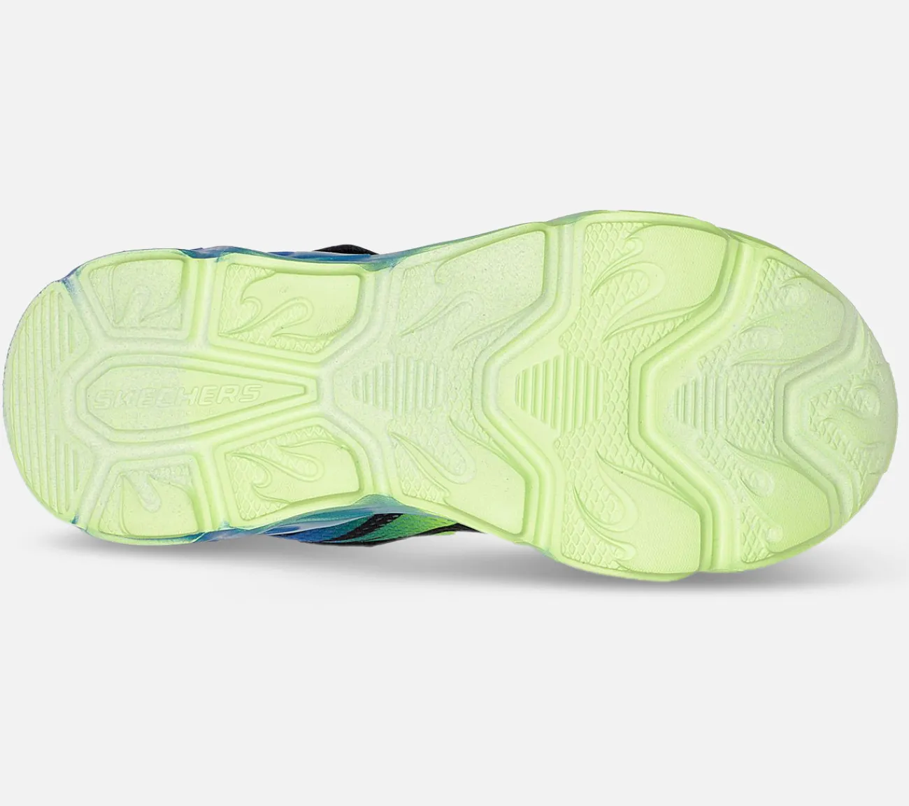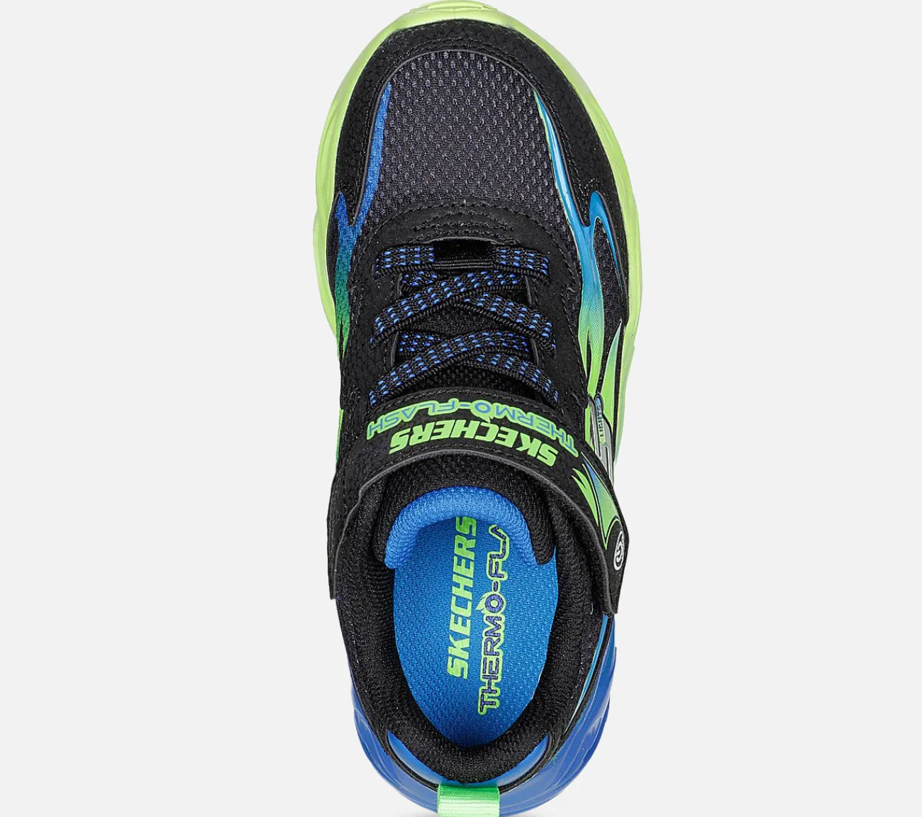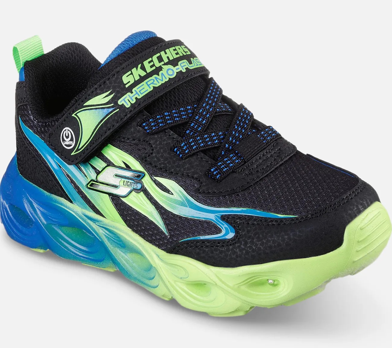 Brænd igennem dagen med flammende lysende sjov i Skechers S-Lights: Thermo-Flash – Heat-Flux. Denne blinkesko har en mesh- og syntetisk overdel med flammedetaljer, en hook-and-loop vristrem, flade stretch-snørebånd og en ‘flammende’ lysende mellemsål.