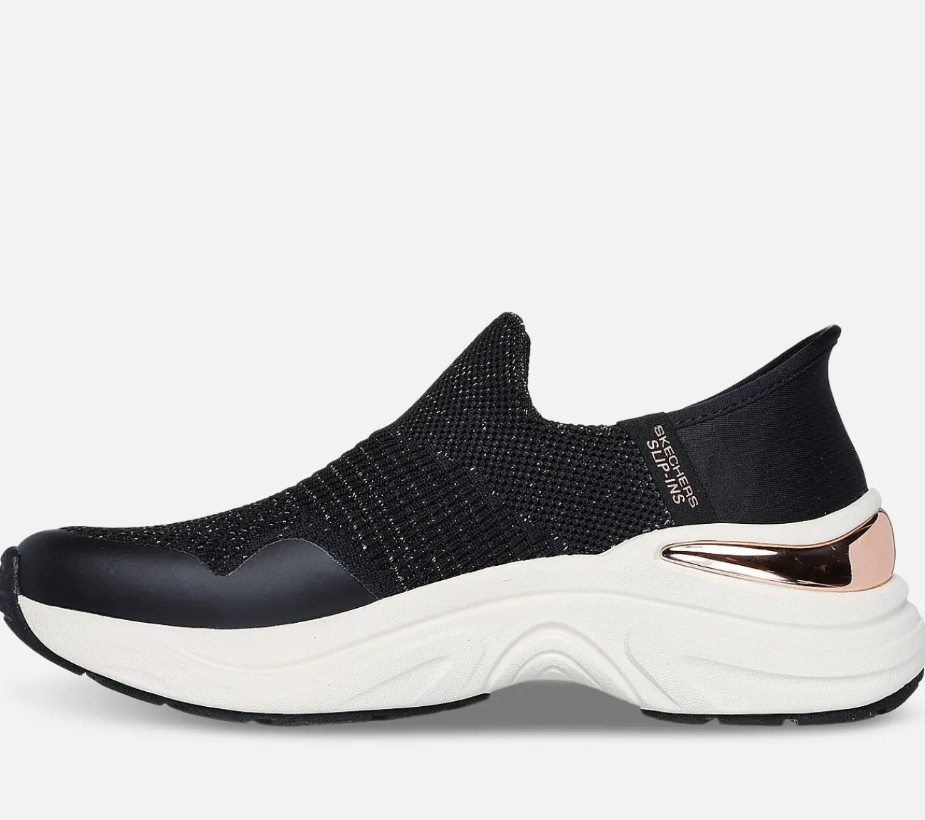 Forbedr din stil med komfort, der er let at bære, med Skechers Street Hands Free Slip-ins: Hazel – Priya. Designet med vores eksklusive Heel Pillow, har denne veganske sko en overdel i specialdesignet strikket materiale og mylar-detaljer samt en metallic hælklemme og en polstret Skechers Air-Cooled Memory Foam indersål.