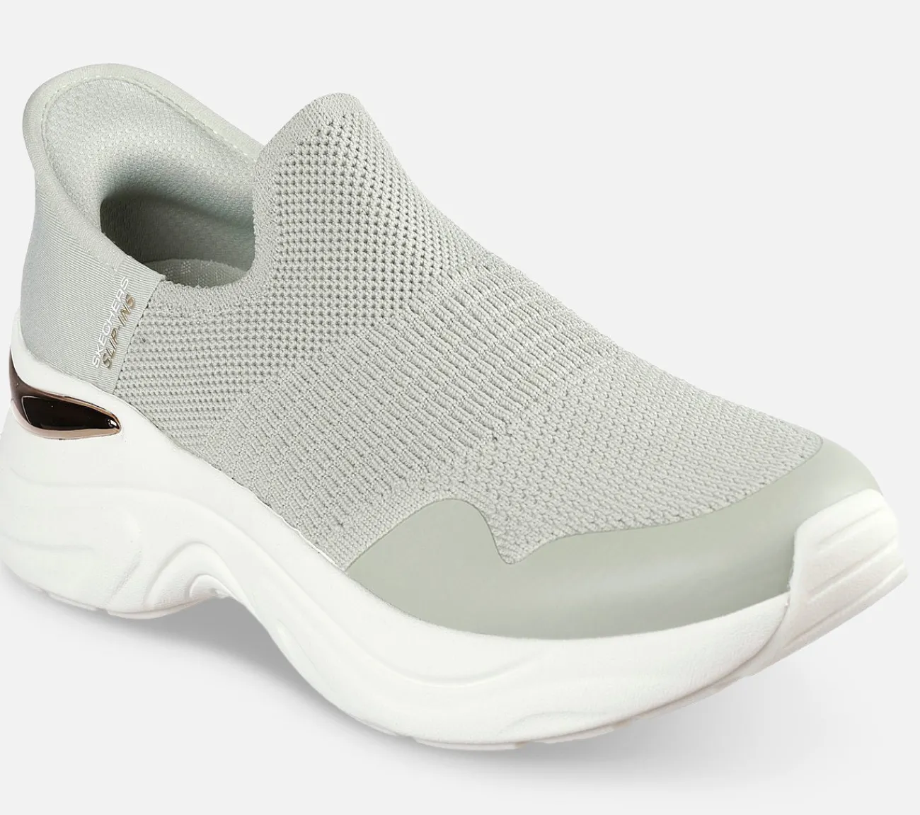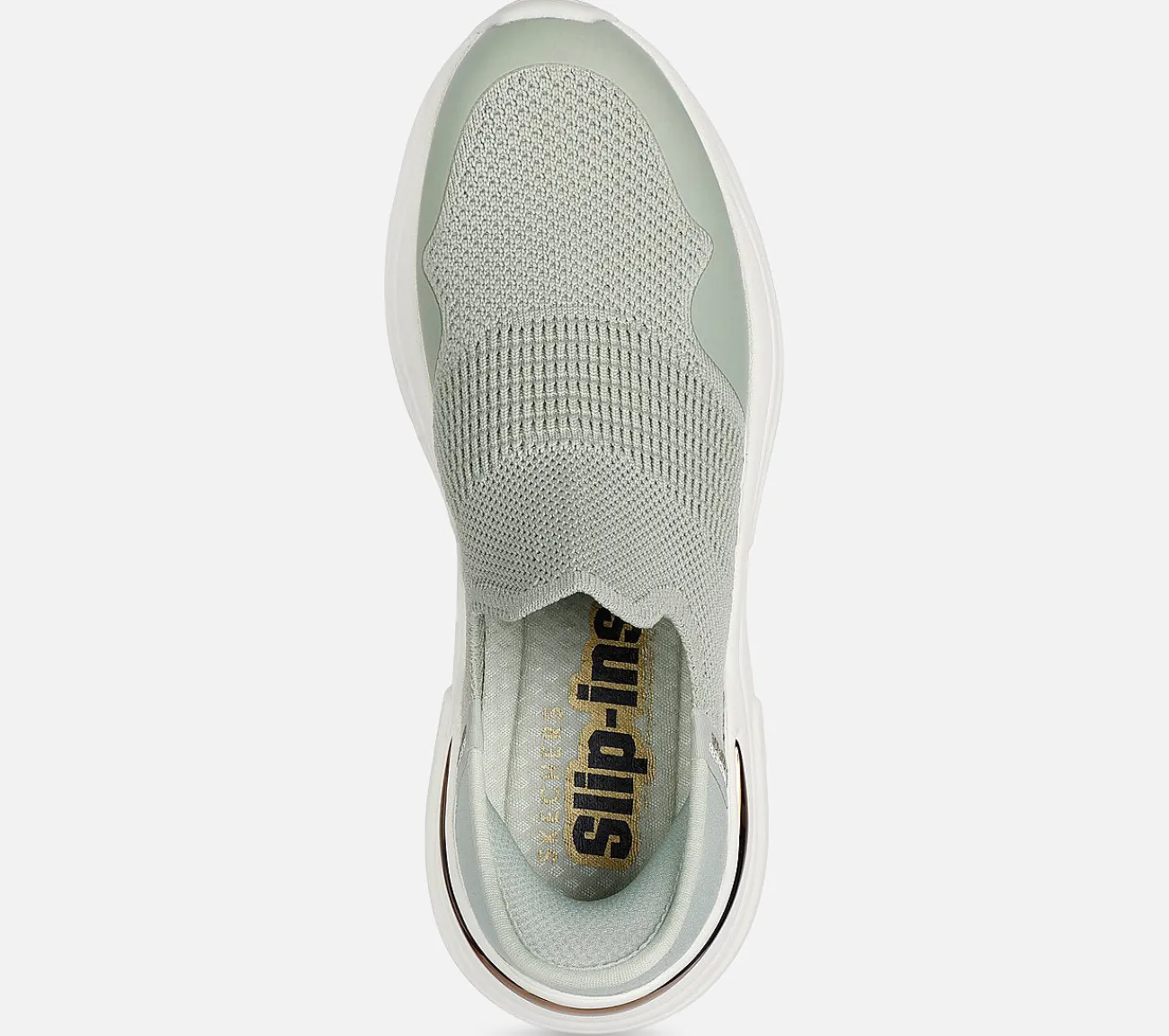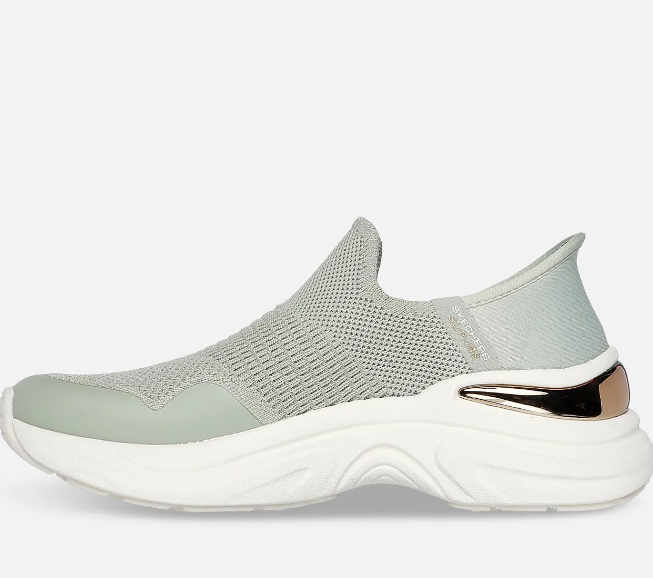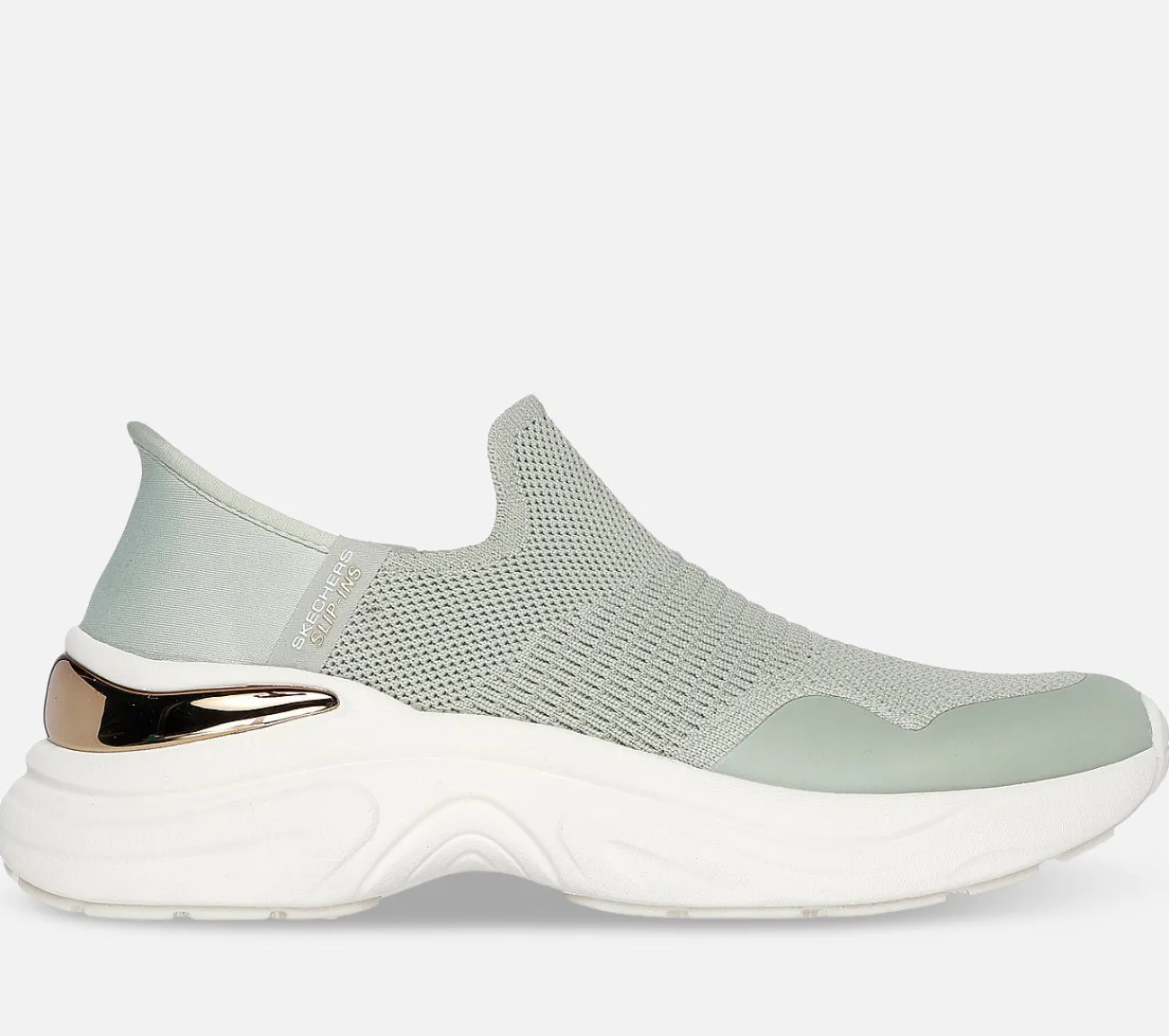 Boost dit look med komfort og stil i Skechers Street Hands Free Slip-ins: Hazel – Rosalind. Designet med vores eksklusive Heel Pillow, har denne veganske sko en strikket overdel i syntetisk materiale med en metallic hælklemme og en polstret Skechers Air-Cooled Memory Foam indersål.