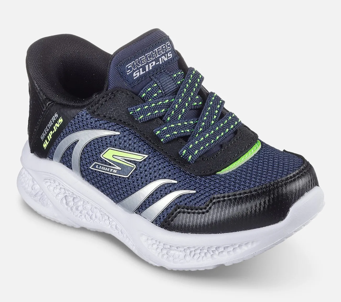 Oplys dine skridt i sportslig stil og komfort med Skechers Hands Free Slip-ins® S-Lights®: Meteor-Lights – Brisk-Beams. Denne lysende slip-on er designet med vores eksklusive Heel Pillow og har en overdel med en varmesmeltet overlejring af netstof og metallisk materiale, samt stræksnører, Skechers Air-Cooled Memory Foam®-indersål og en stødabsorberende, lysende mellemsål.