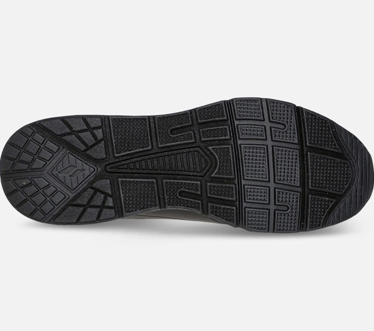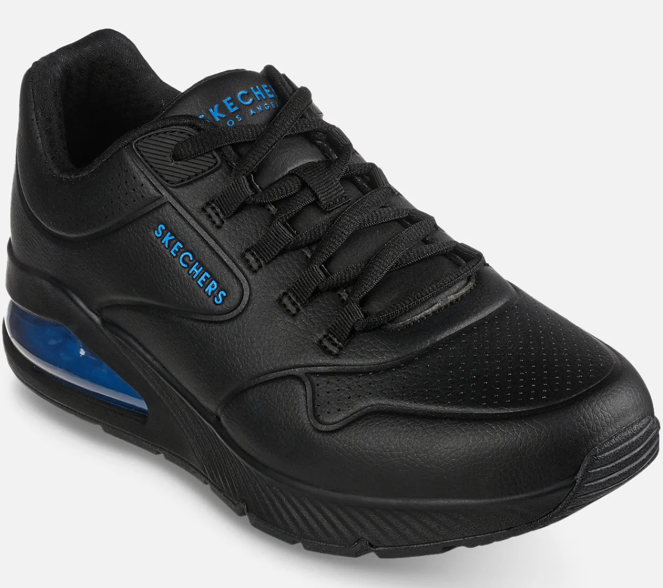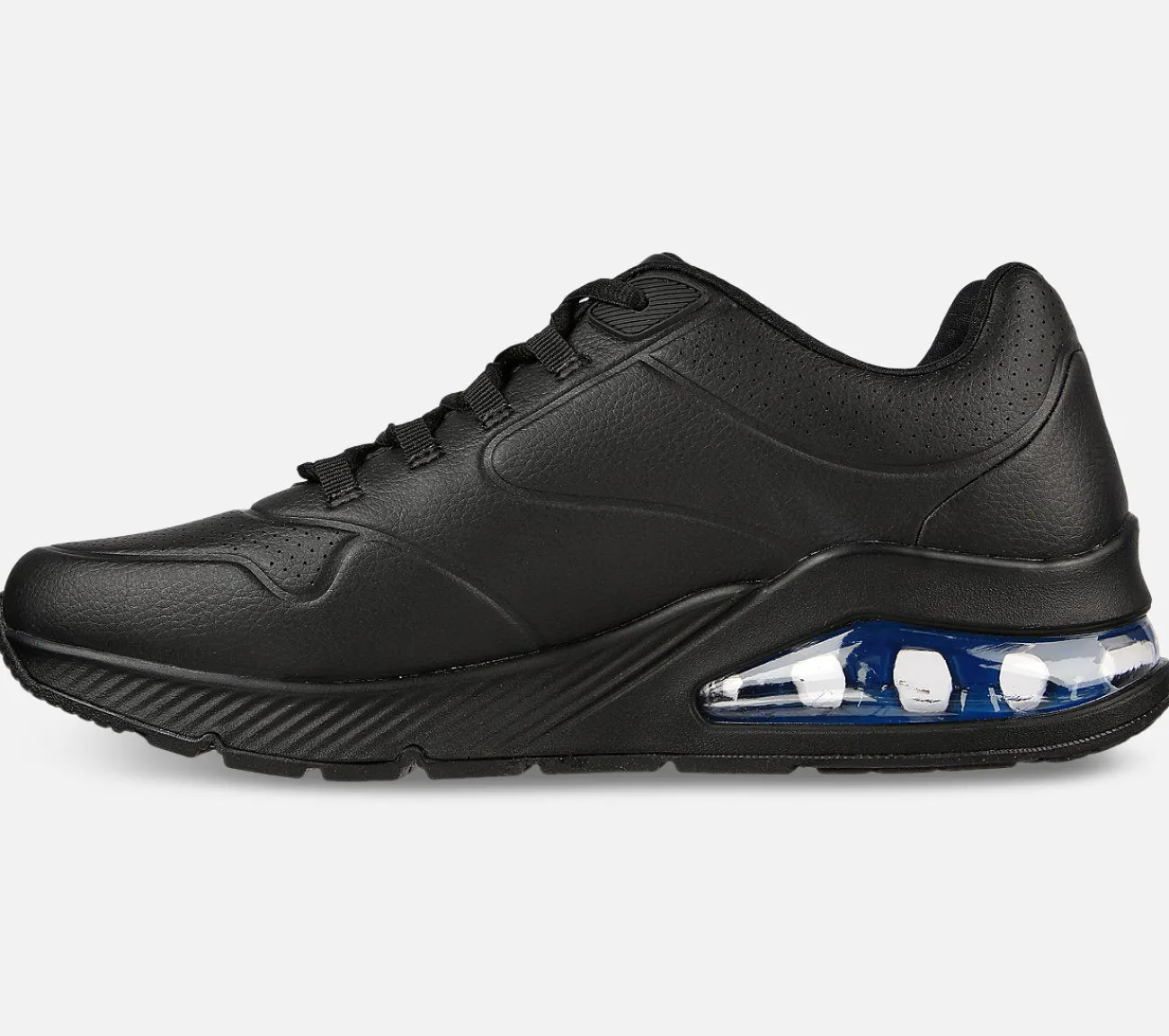 Atletisk komfort leveres i Skechers Street Uno 2. Denne modesneaker med snørebånd har en perforeret duraleather overdel med en Skechers Air-Cooled Memory Foam indersål og en synlig Skech-Air luftpolstret mellemsål.