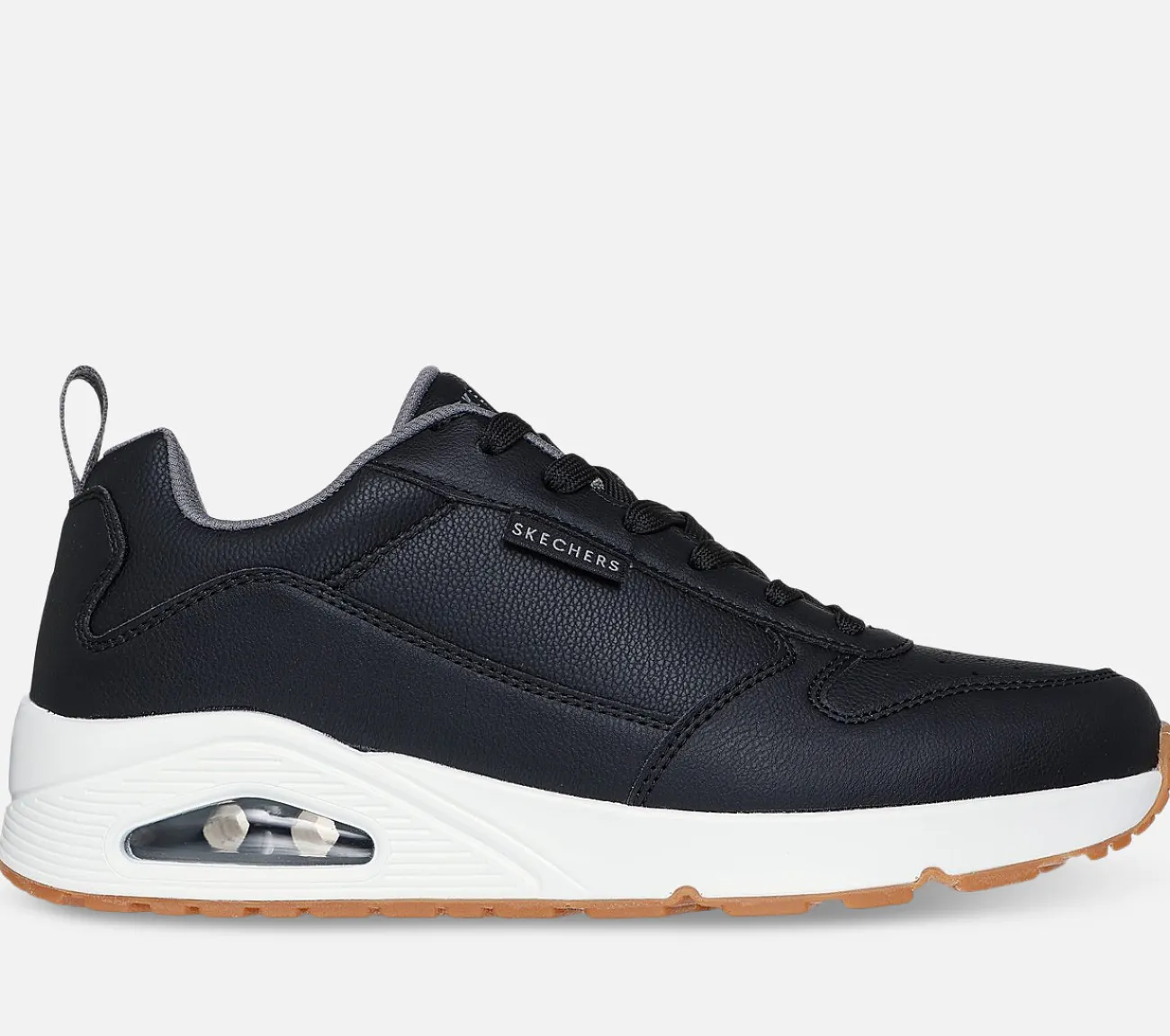 Glat, sporty stil og kølig komfort forenes i Skechers Street Uno – Alder. Denne sneaker har en overdel i duraleather, en Skechers Air-Cooled Memory Foam indersål og en Skech-Air synlig airbag mellemsål.