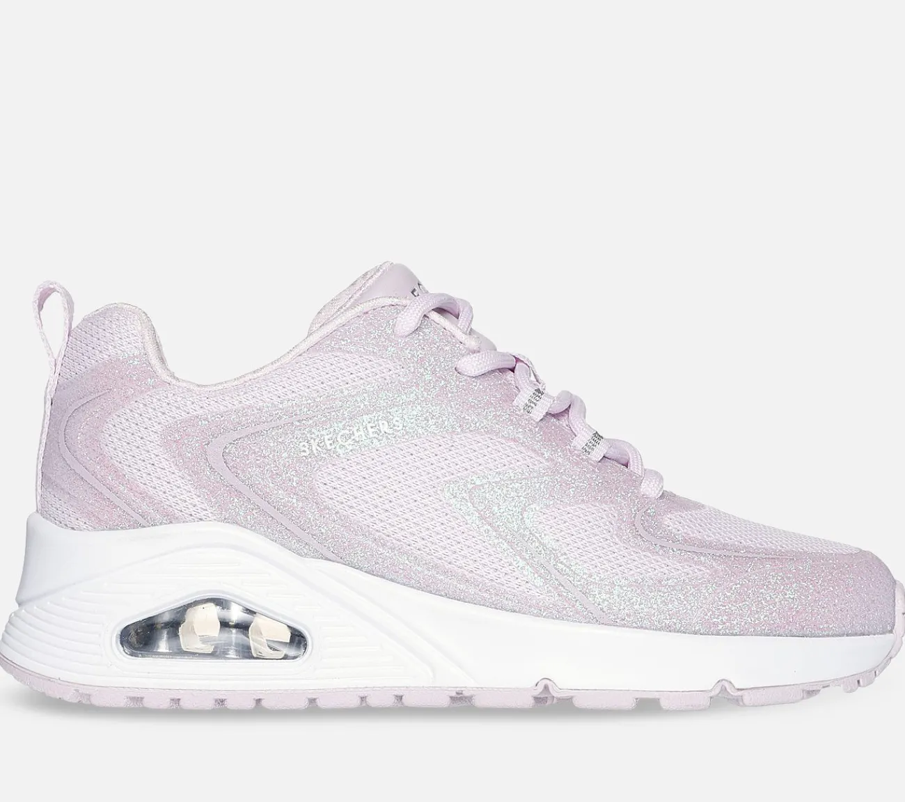 Glam up din stil med glitrende polstret komfort ved at bære Skechers Street Uno – Glit-Airy Steps. Denne modesneaker har en mesh-overdel med hotmelt glimmerdetaljer, en Skechers Air-Cooled Memory Foam indersål og en synlig Skech-Air airbag mellemsål.
