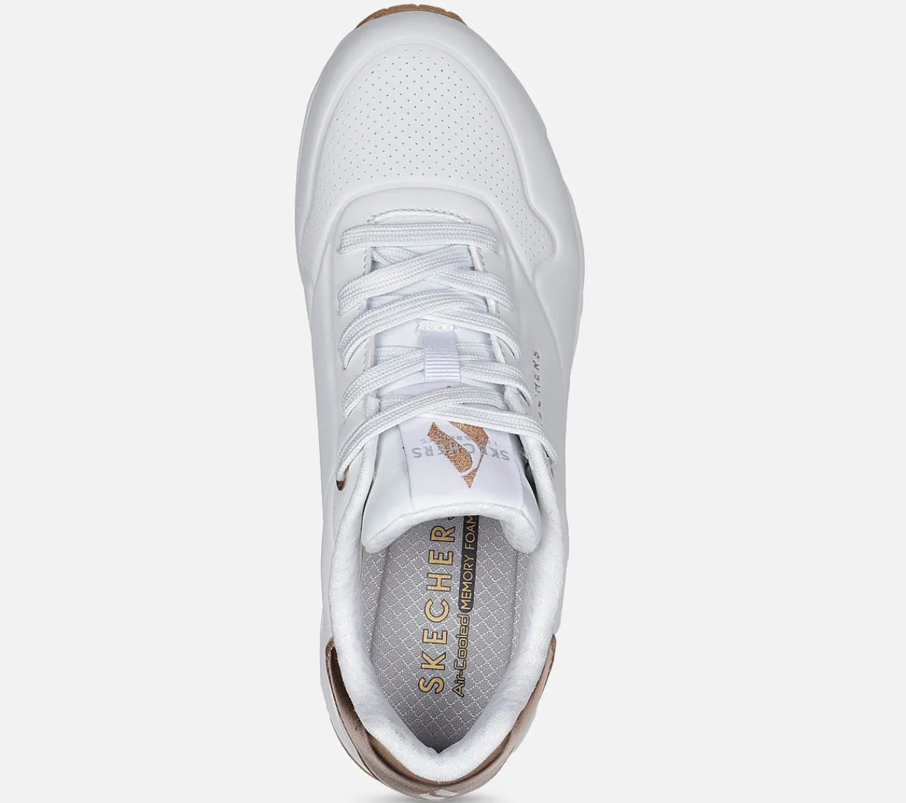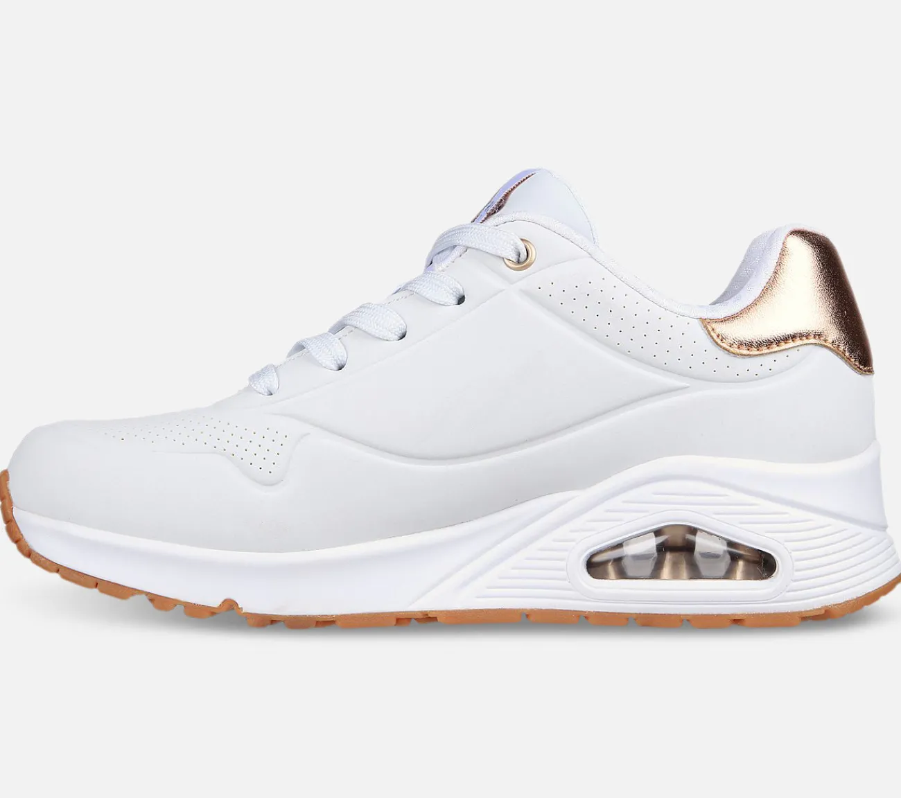 Løft din stil med Skechers Street Uno – Golden Air. Denne snøre-mode har en glat durabuck overdel med gulddetaljer, en polstret Skechers Air-Cooled Memory Foam komfort indersål og en Skech-Air synlig airbag mellemsål.