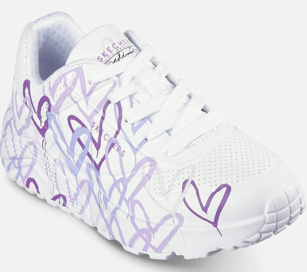 Den kendte kunstner James Goldcrown bringer sine ikoniske Lovewall – hjertedesigns til Skechers i dette inspirerende samarbejde. Street Uno Lite– Spread The Love by JGoldcrown er en smart og funky sneaker der har et allover print med flotte farverige hjerter.