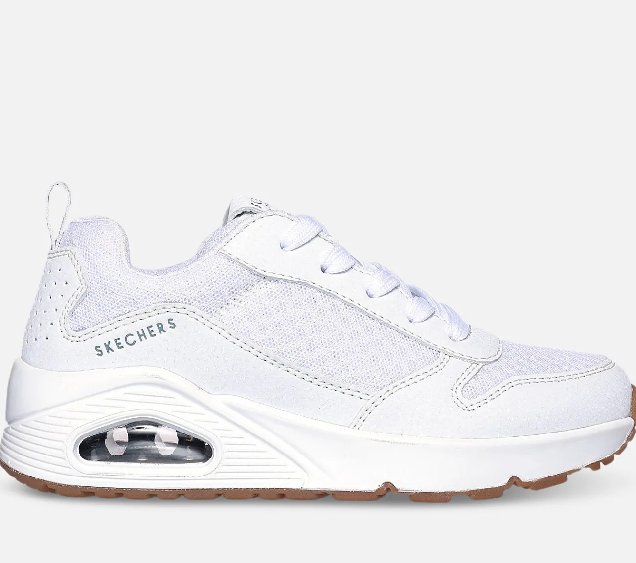 Skil dig ud i sporty stil og komfort med Skechers Street Uno – Powex. Denne mode snøresko har en syntetisk og mesh overdel med en Skechers Air-Cooled Memory Foam indersål og en synlig airbag mellemsål.