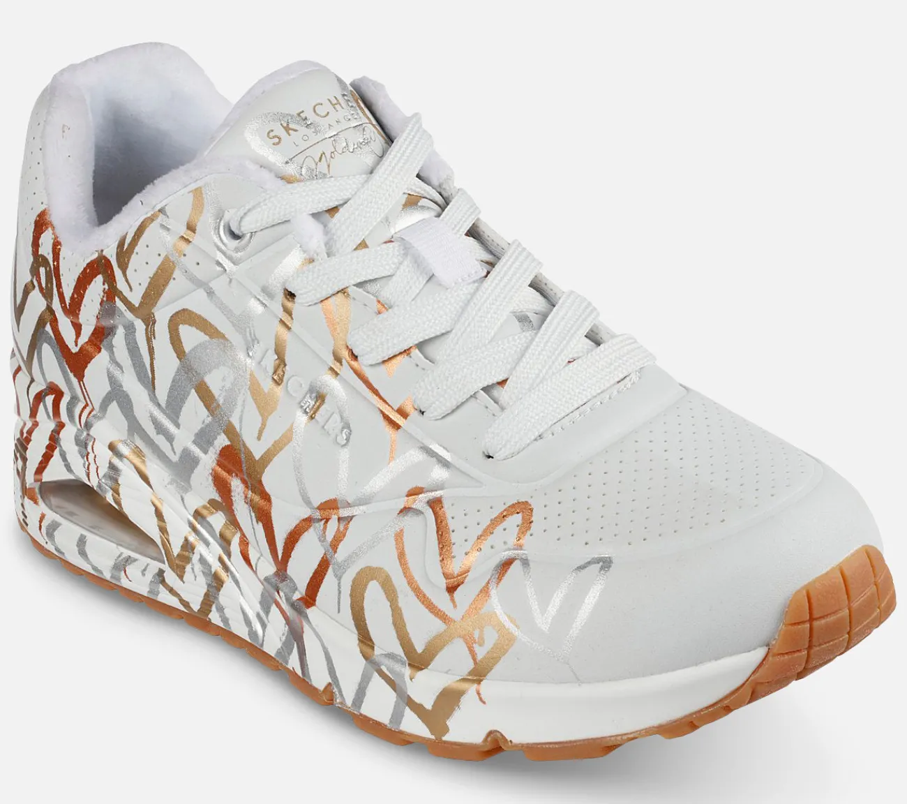Den kendte kunstner James Goldcrown bringer sine ikoniske Lovewall – hjertedesigns til Skechers i dette inspirerende samarbejde. Street Uno – Metallic Love by JGoldcrown er en super chik sko med en masse moderne teknologier der sikrer dig den ypperste komfort.