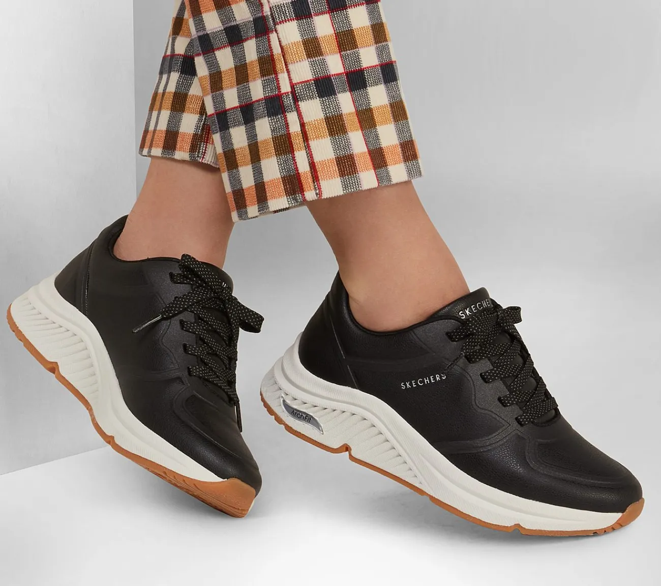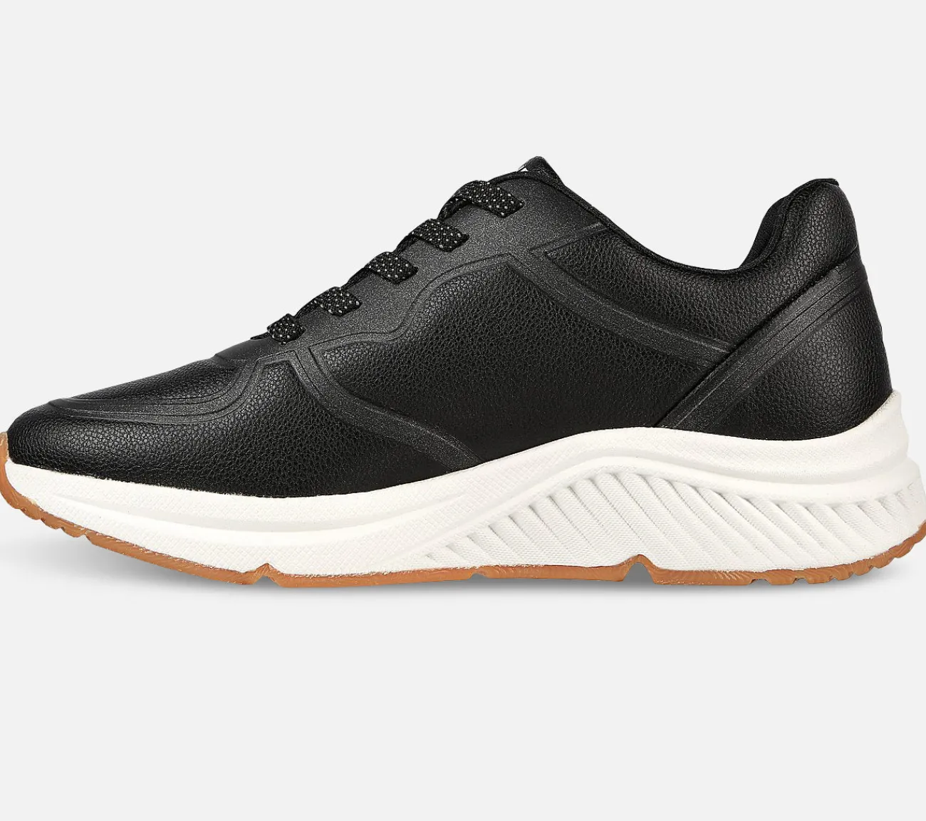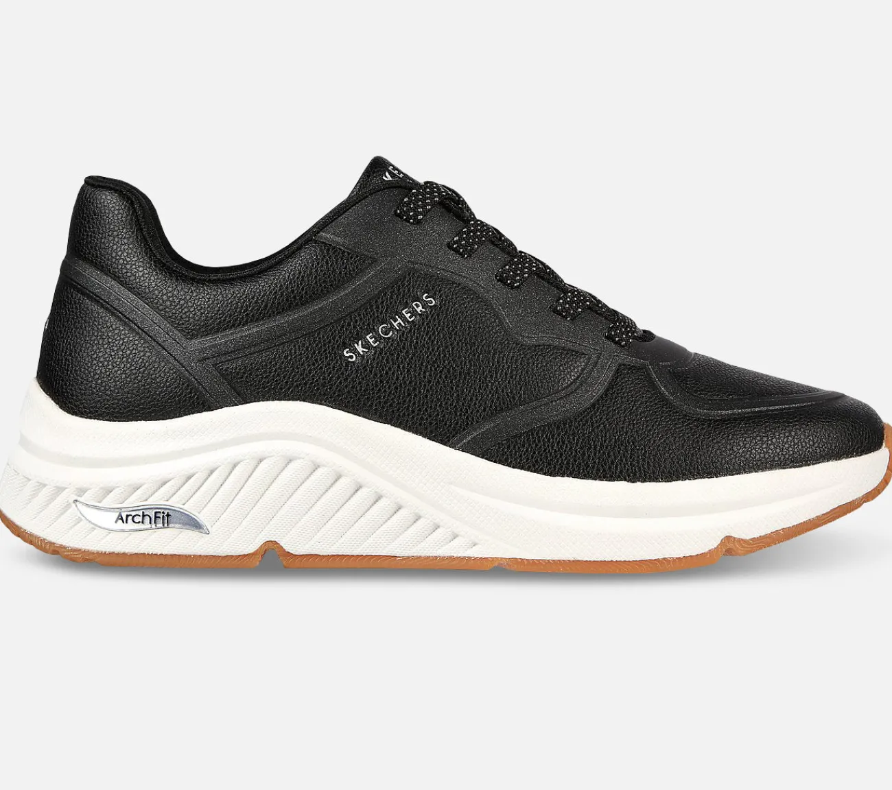 Skechers Arch Fit S-Miles – Mile Makers er en hverdagssko I sporty stil, med ekstra støtte under svangen. Her er stil og komfort i fokus. Skoens overdel er fremstillet i syntetisk læder, hvilket giver et glat og elegant udseende.