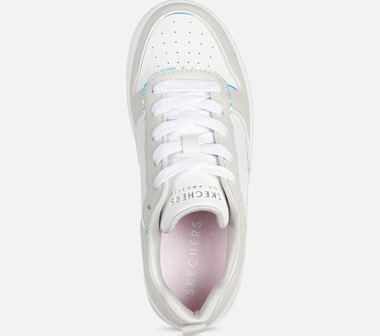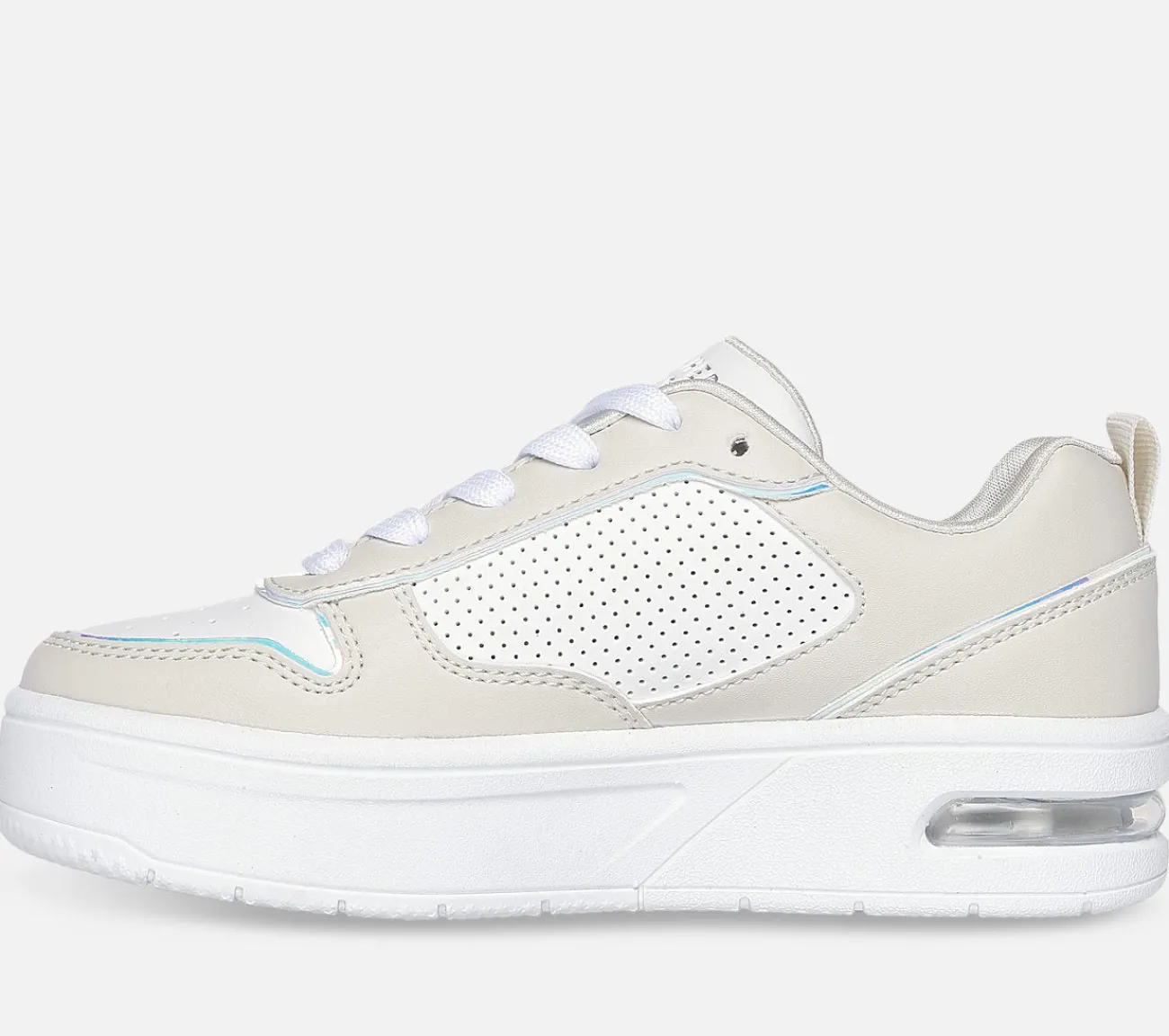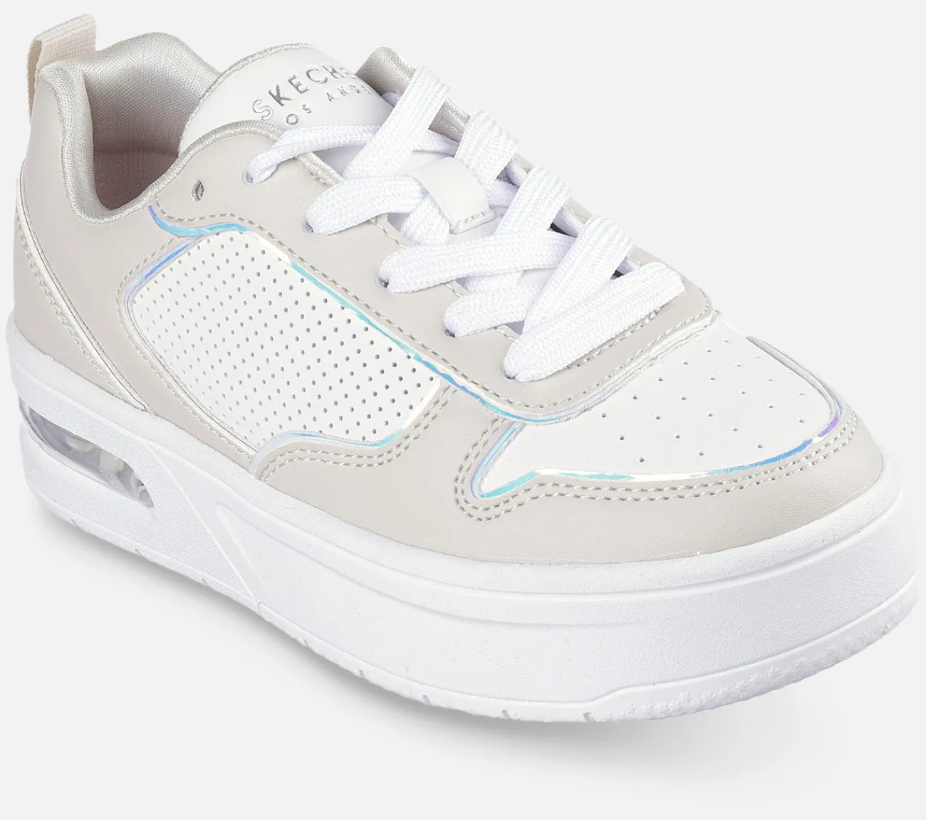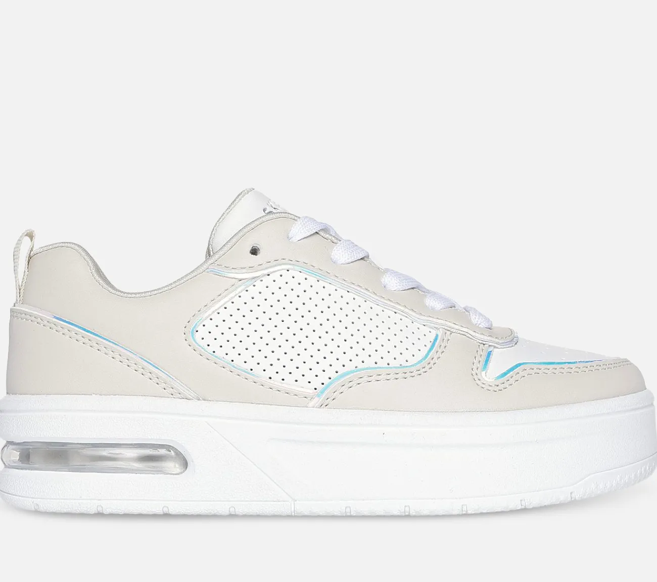 Vis din stil frem med Skechers Street Court HI-Air. Denne sneaker med snørebånd har en syntetisk overdel med synlig Skech-Air luftpude, en blød komfortabel indersål og en platform-ydersål.