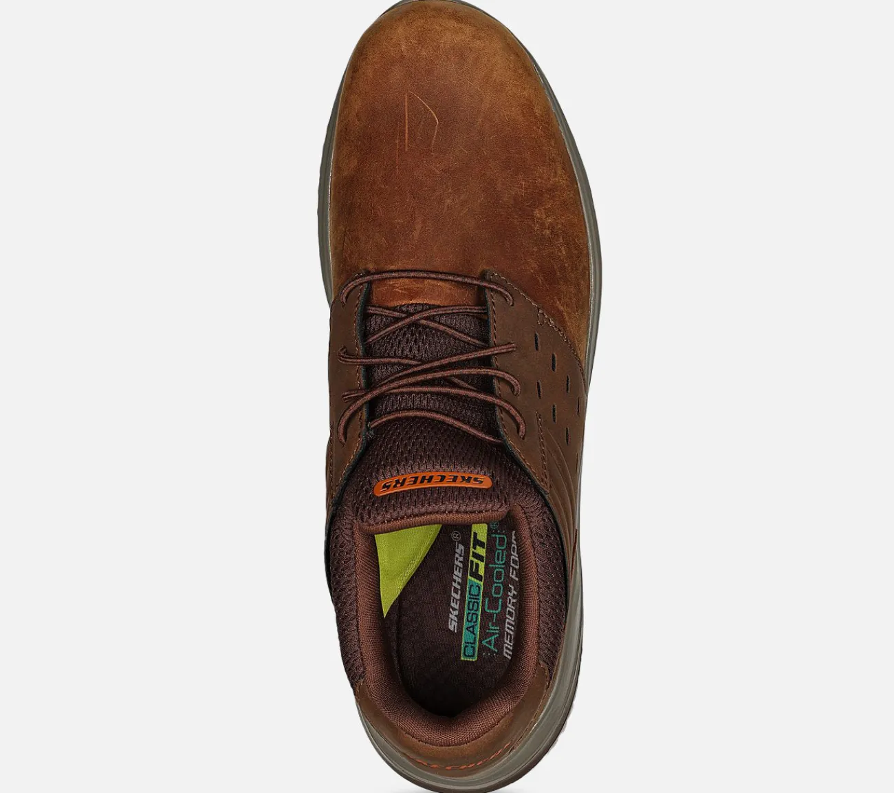 Den lette og alsidige Skechers Street Delson 3.0 – Ezra opdateres med ekstra komfort. Denne slip-on sko har en læderoverdel og en Skechers Air-Cooled Memory Foam indersål samt Goga Mat Arch polstring for ekstra støtte.