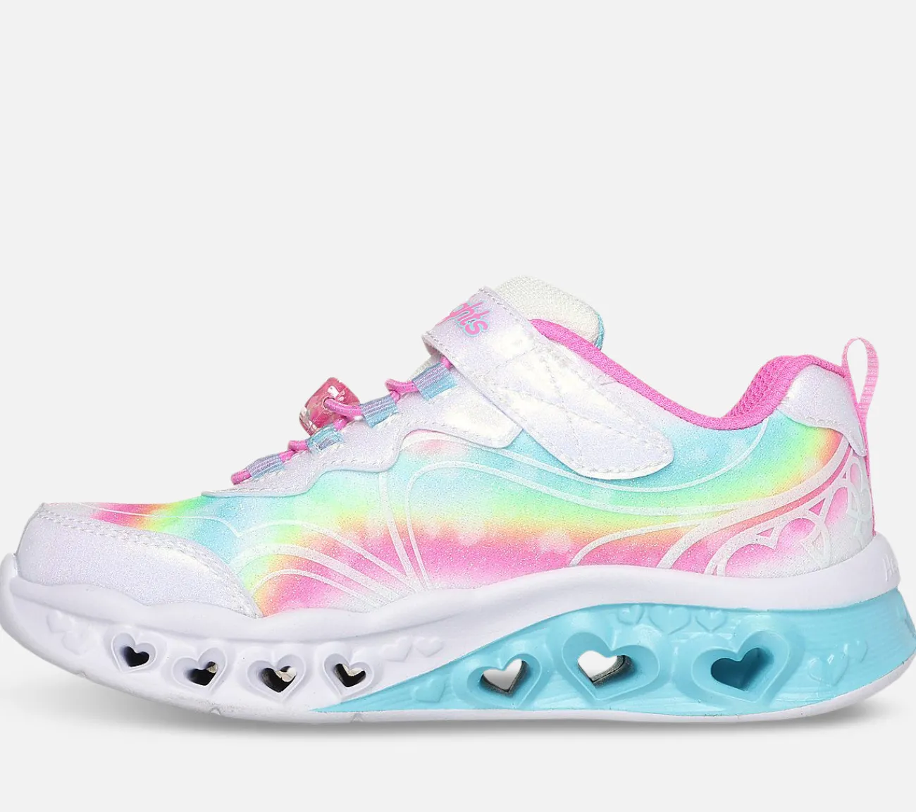 Denne blinkesko har et flerfarvet glitterprint på stoffet og en syntetisk glitteroverlægning. De elastiske snørebånd med hjertesmykke og den justerbare rem på vristen giver en ekstra detalje til designet. Oplev glæden ved at gå med disse sko, der ikke kun er stilfulde, men også har lysende elementer.