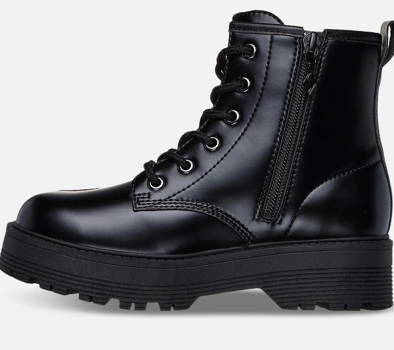 Se super sej ud med Skechers Gravlen Hi – Metallic Heart. Denne støvle er udsmykket med udskårne, metalliske hjerter og har en glat overdel i kunstlæder, lynlås på siden og en robust platform mellemsål.