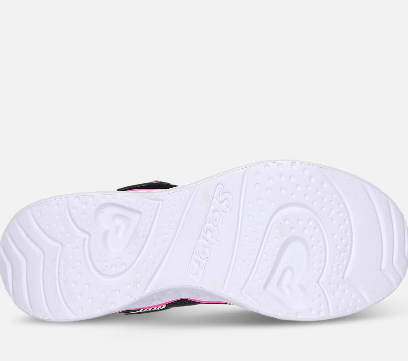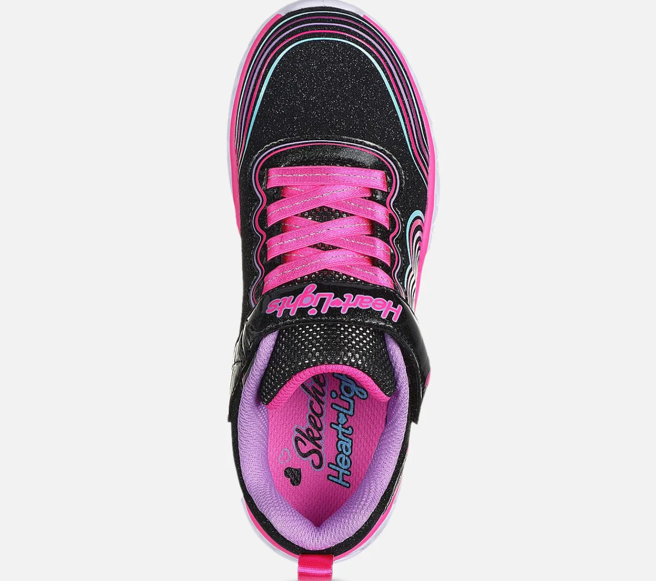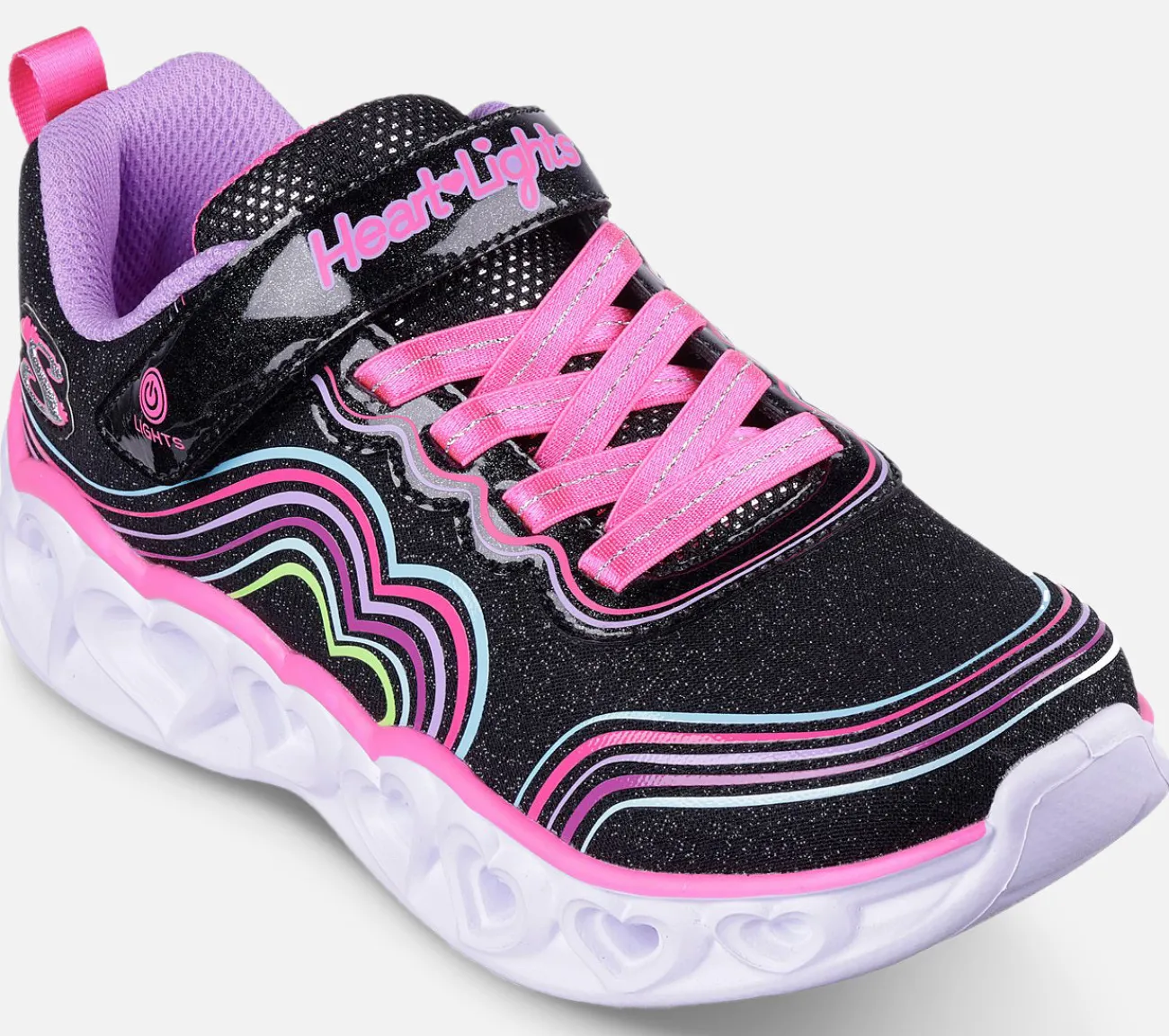 Oplev magien ved hvert skridt med blinkende hjerte sko. Skechers Heart Lights – Retro Hearts har en overdel i glimmermesh med et 3D-regnbuehjerteprint og en lysende mellemsål med ‘hjertekæde’-detalje. Uanset om det er til skoledage eller weekendeventyr, sikrer de elastiske snørebånd og den støddæmpende polstrede mellemsål, at dit barn oplever ultimativ komfort med hvert skridt.