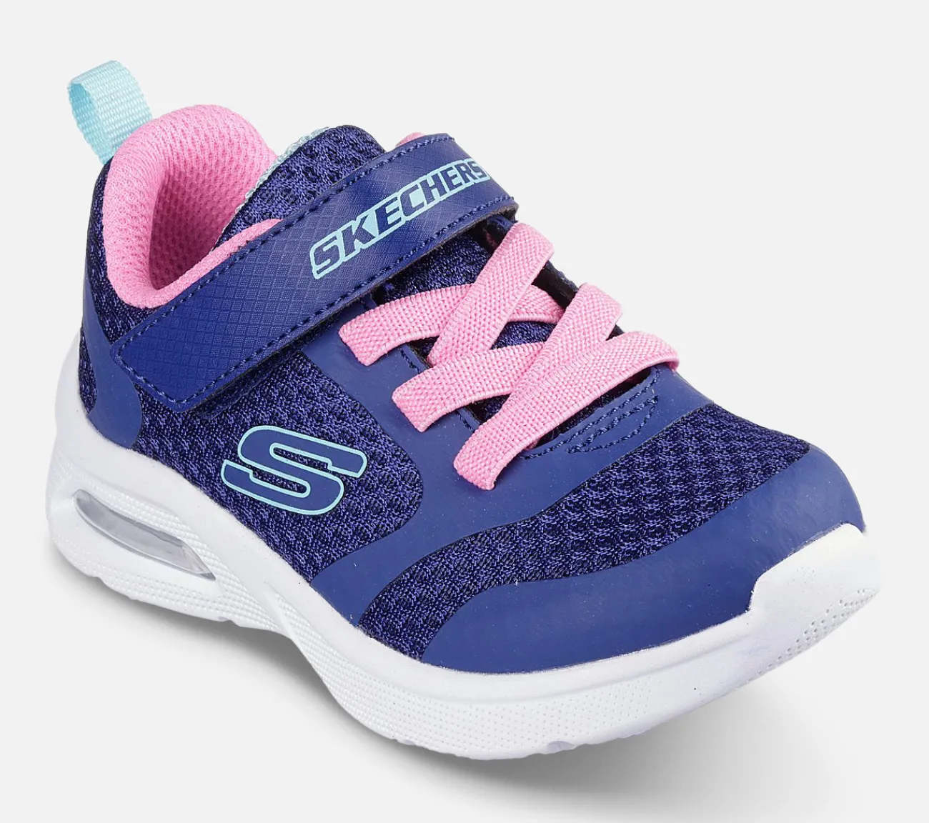 Giv ekstra komfortabel støddæmpning til en sporty stil med Skechers Microspec Max – Racer Gal. Denne pull-on sko har en mesh overdel med elastiske snørebånd, vristrem og en synlig Skech-Air airbag mellemsål.