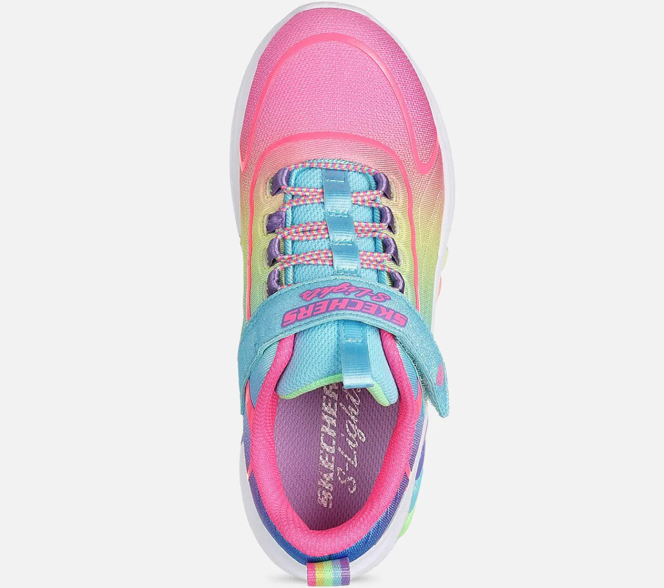 Lys op i stil med disse farverige og blinkende Skechers Rainbow Cruisers. Dette lysende design har en ombre vævet overdel med elastiskbånd og en justerbar rem over vristen med en tænd/sluk-knap.