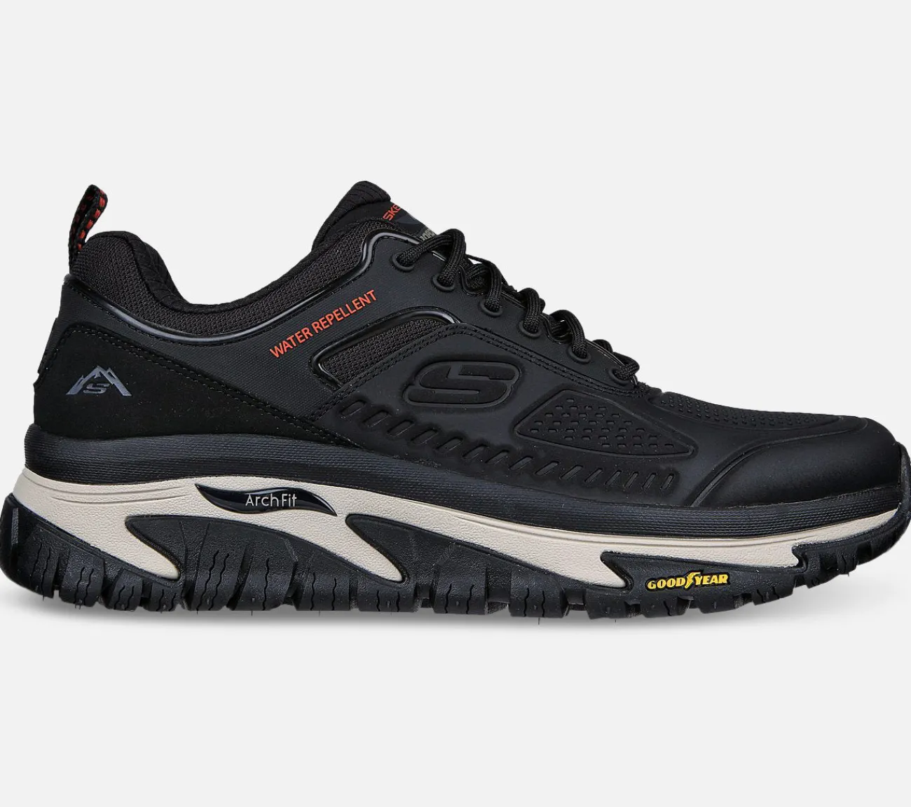 Udforsk nye steder i langvarig støttende komfort med Skechers Relaxed Fit: Arch Fit Road Walker – Recon. Dette udendørs trail-design har en snørelukning og en vandafvisende læderoverdel med en udtagelig Arch Fit indersål og en Goodyear Performance ydersål.
