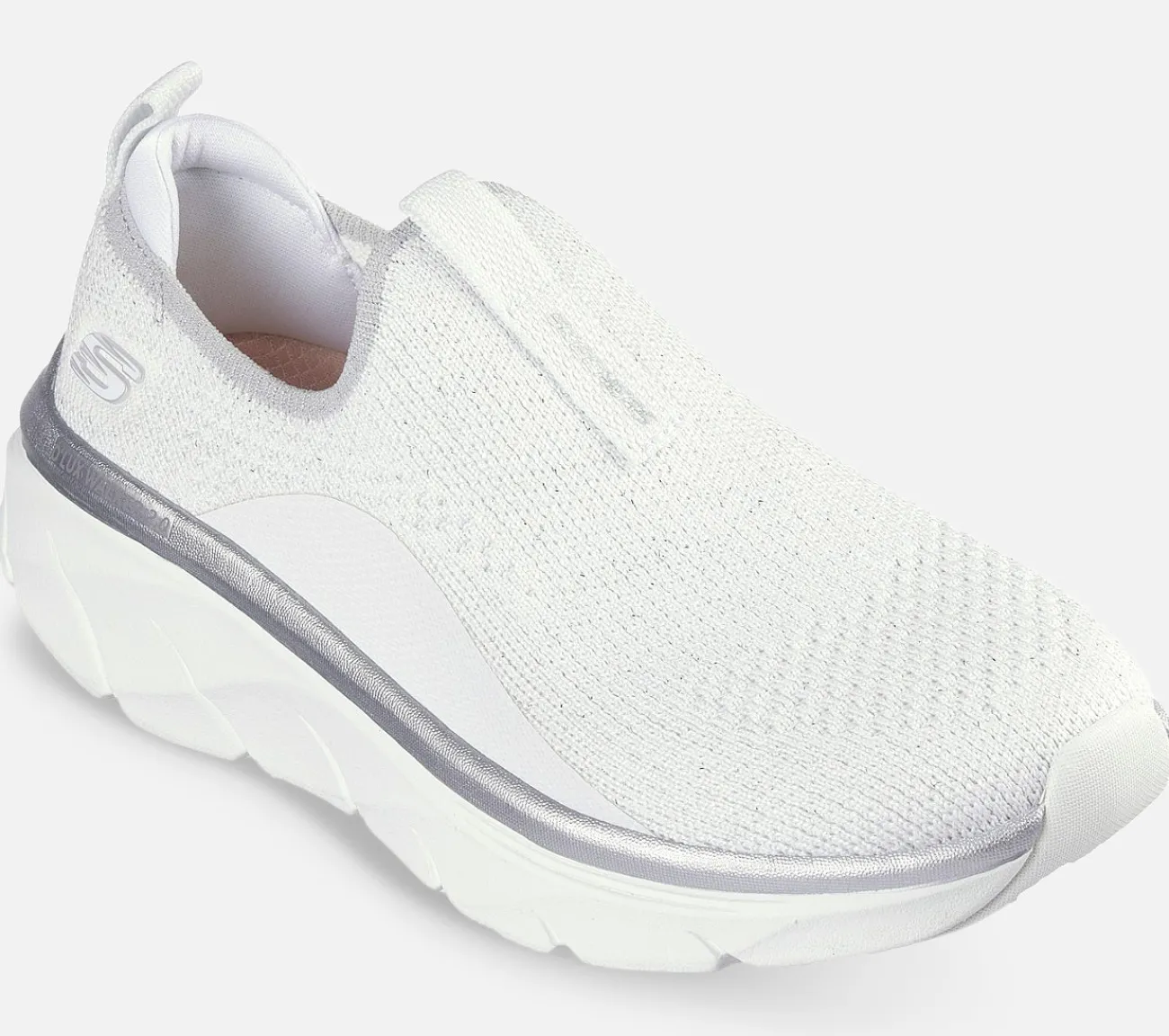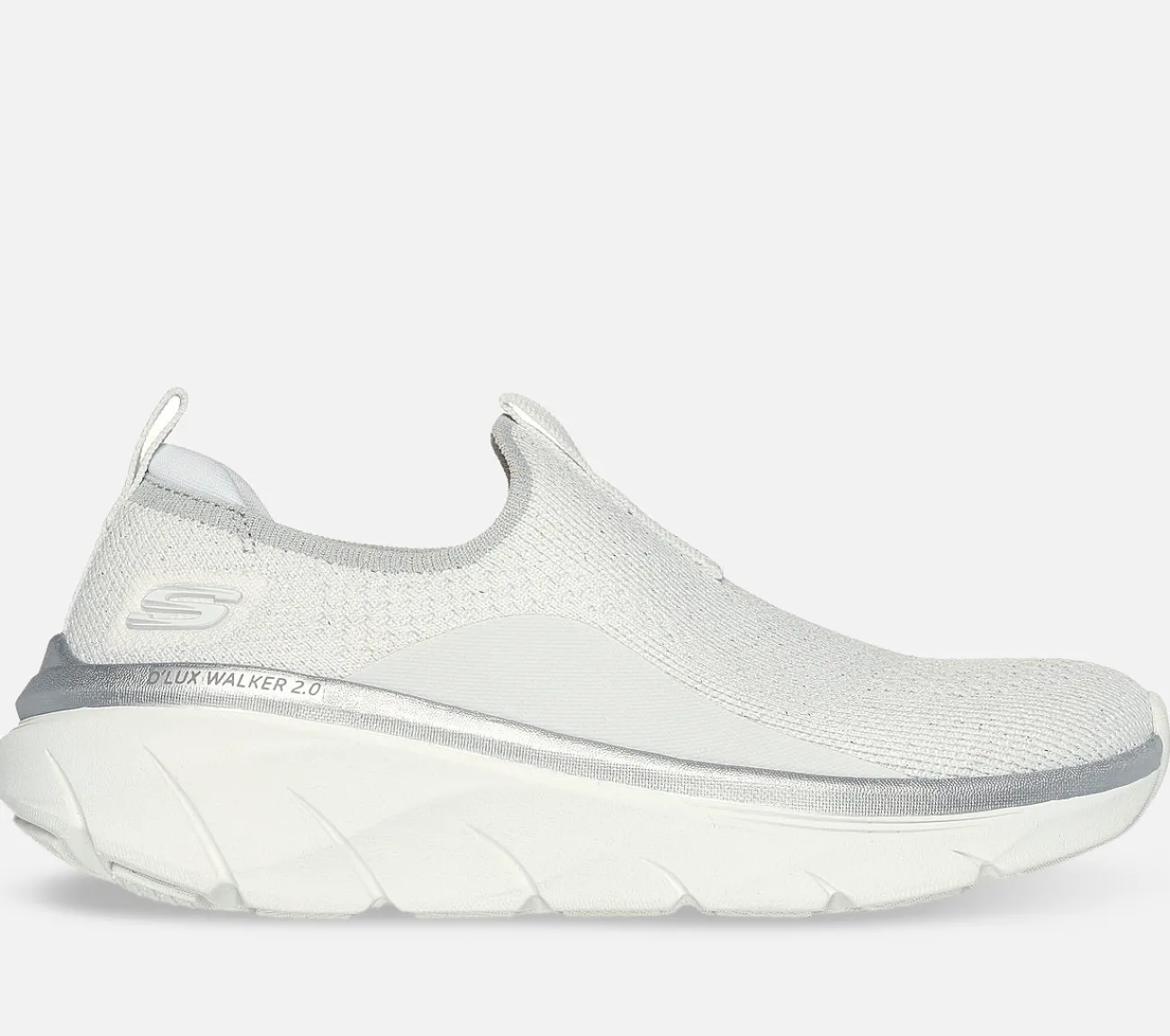 Nyd længere gåture med støttende komfort i Skechers Relaxed Fit: D’Lux Walker 2.0 – Sparkle Forever. Denne sporty sko uden snørebånd har en Stretch Fit strikket overdel, metallisk trimmet mellemsål og en polstret Skechers Air-Cooled Memory Foam indersål.