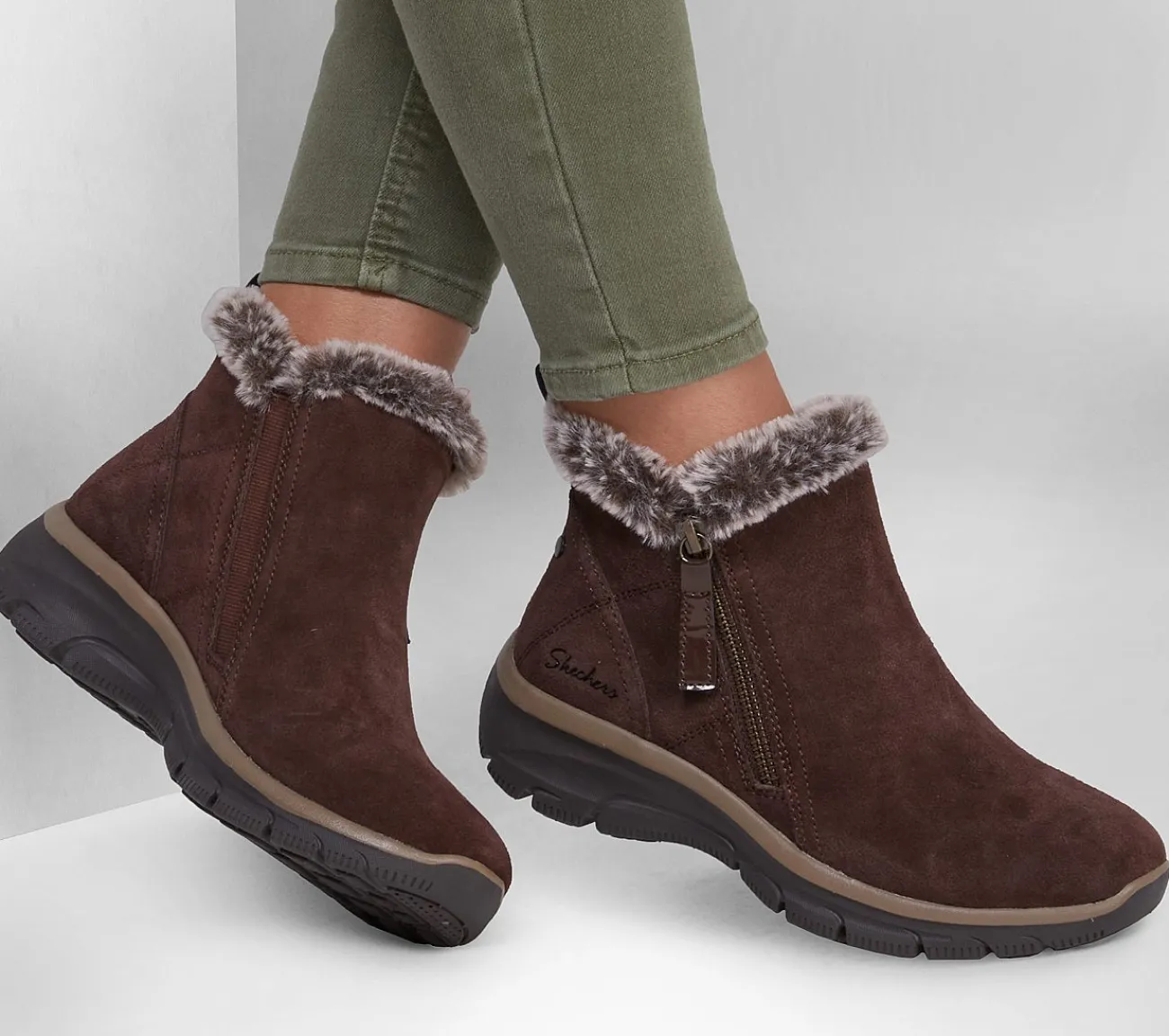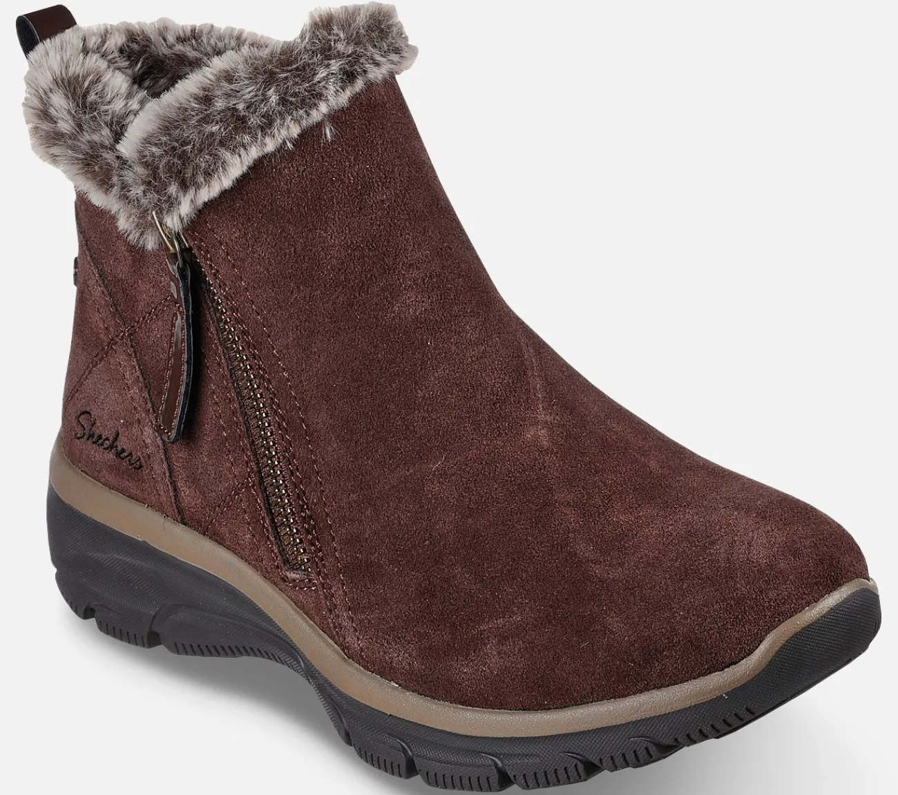 Stilfuldt udseende og hyggelig varm komfort kombineres i Skechers Relaxed Fit: Easy Going – High Zip. Denne ankelstøvle med lynlås har en ruskindsoverdel med faux fur trim og en polstret Skechers Air-Cooled Memory Foam indersål.