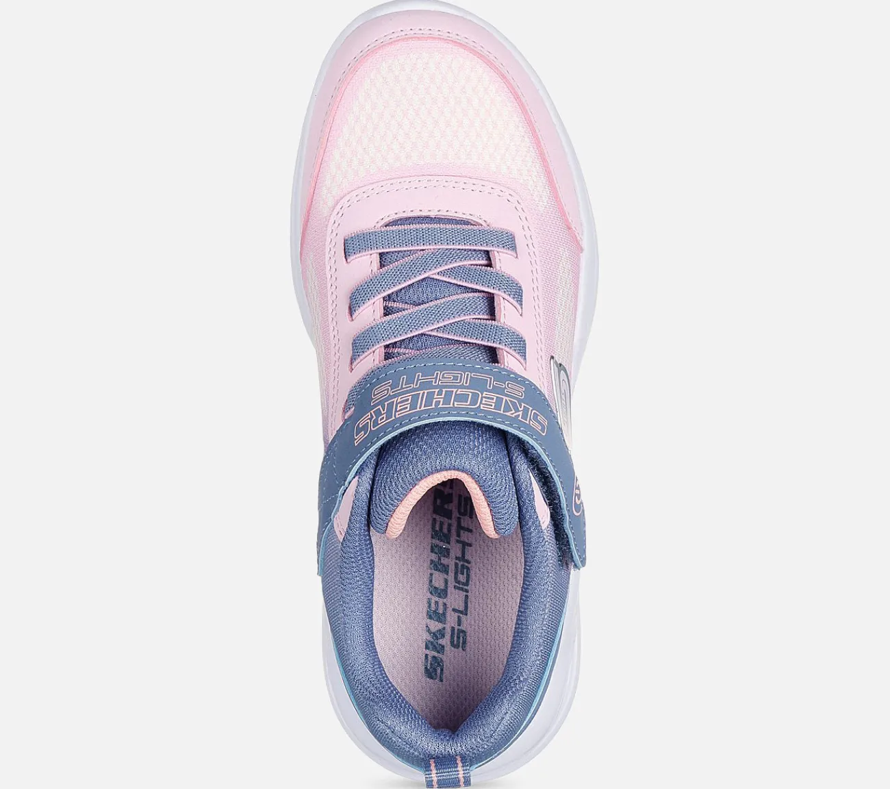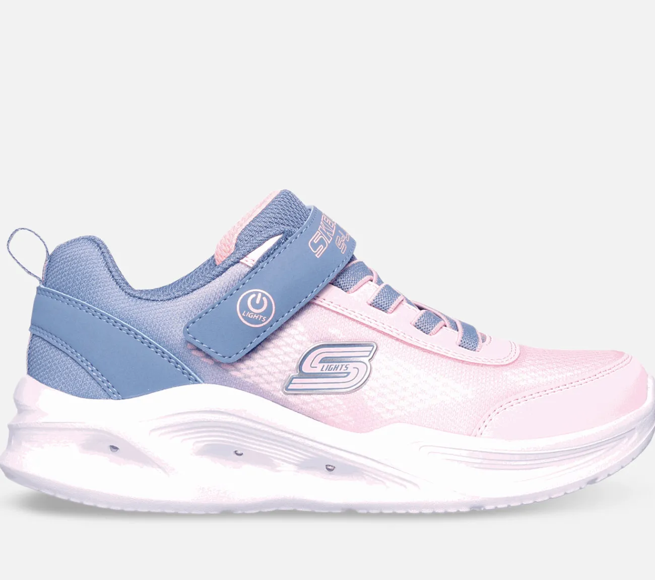 Bring sjov til sporty mode med Skechers S-Lights: Sola Glow – Ombre Deluxe. Denne aktive sko med flerfarvet lysdesign har en ombre mesh- og syntetisk overdel med strækbare snørebånd, justerbar rem over vristen og en velpolstret mellemsål, der lyser op.