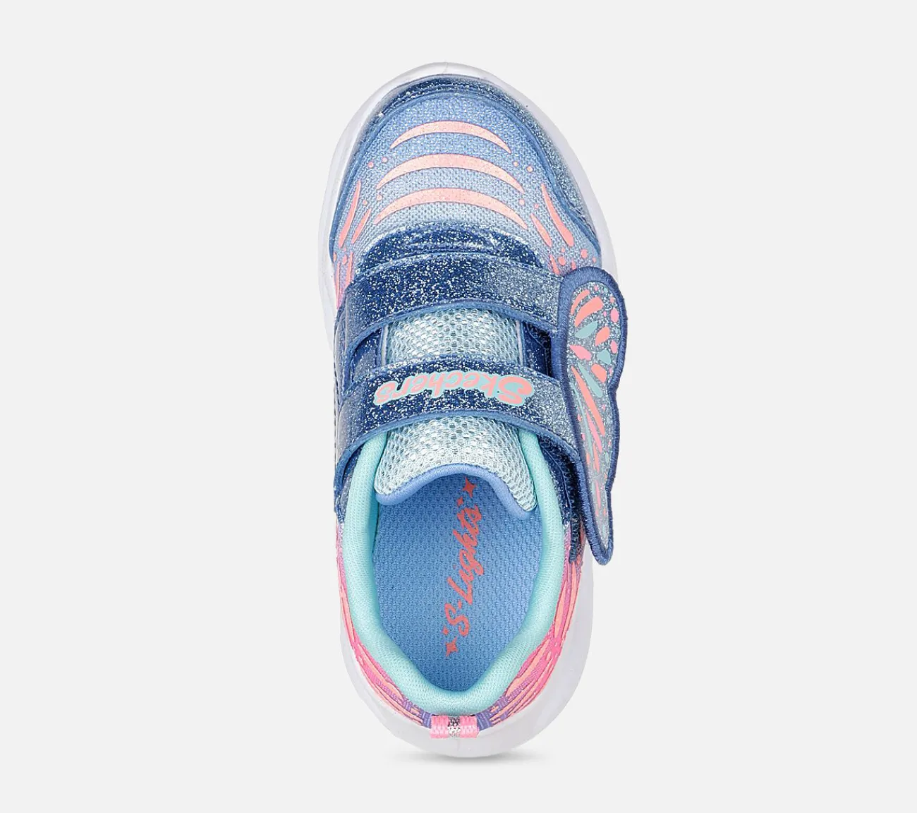 Gør dine skridt strålende med stil og komfort med Skechers S-Lights: Twisty Brights – Wingin’ It. Denne lette slip-on sko har en overdel af mesh og glitrende syntetisk materiale samt en sommerfugleformet rem over vristen og en lysende mellemsål.