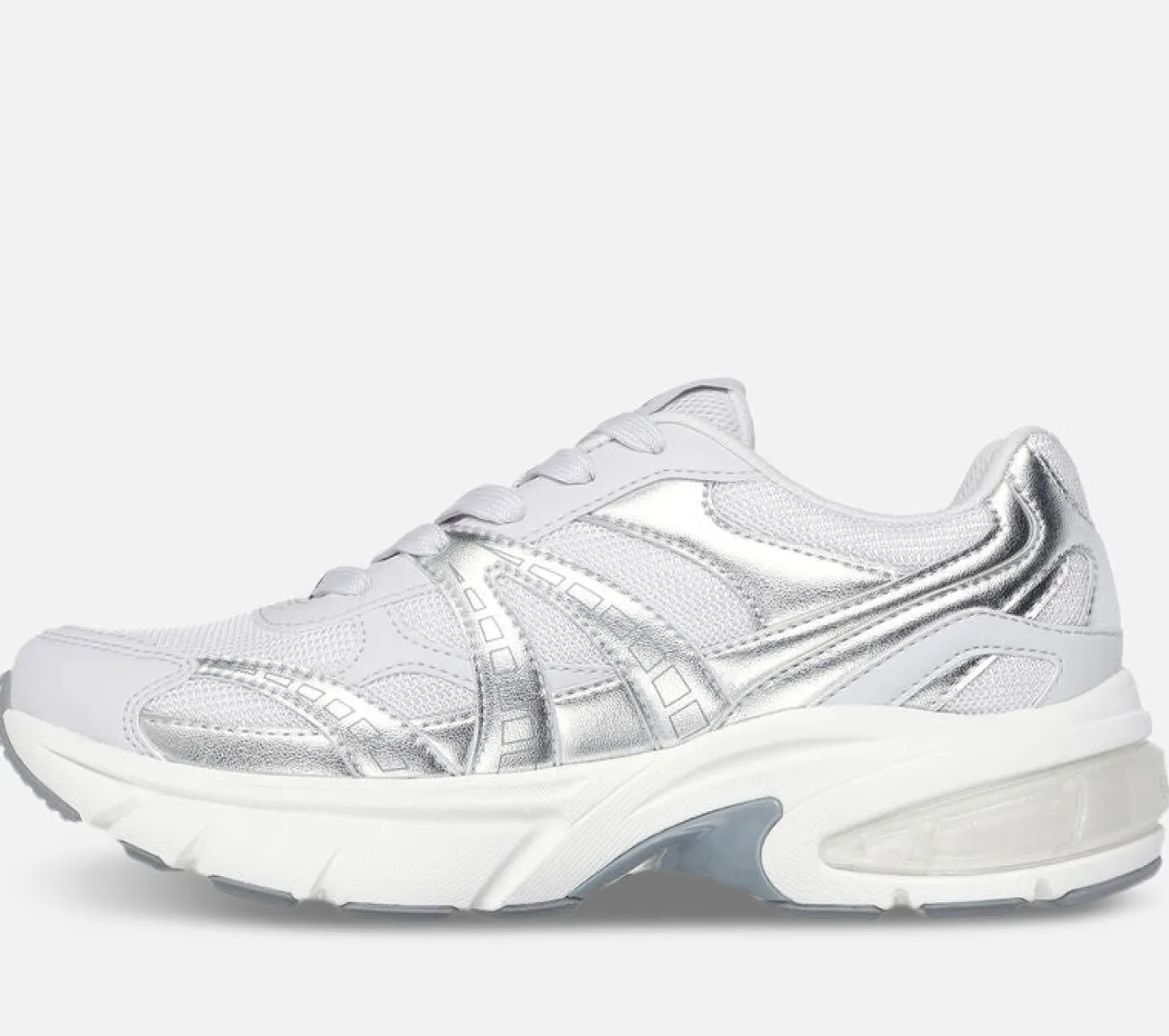 Vis din sportslige divastil frem med Skechers Street Skechers Shadow – Stellar 90. Denne modesneaker med snører har en overdel af metallisk duralæder og mesh, et gennemsigtigt indlæg i mellemsålen og en polstret Skechers Air-Cooled Memory Foam®-indersål.