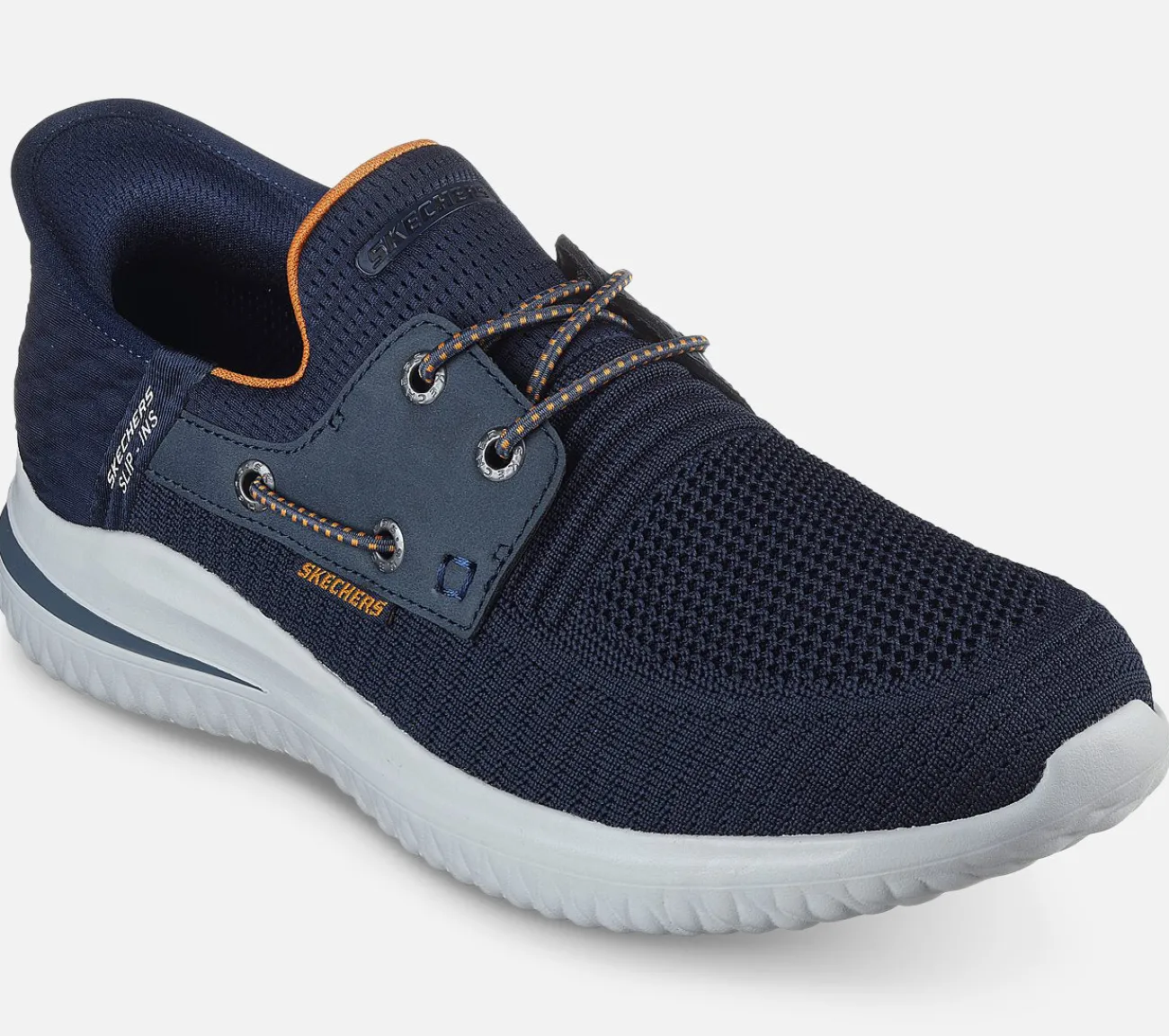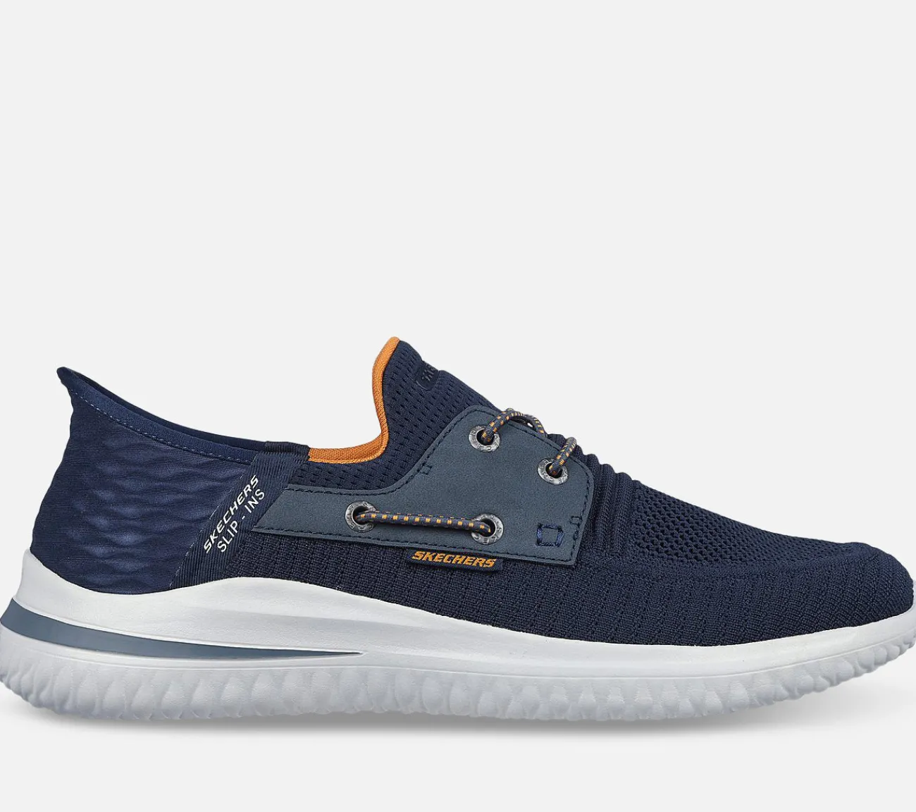 Træd blot ned i skoen og gå med Skechers Hands Free Slip-ins: Delson 3.0 – Roth. Designet med vores eksklusive Heel Pillow. Denne sko har en specialdesignet strik- og syntetisk overdel med elastiske snørebånd, en Skechers Air-Cooled Memory Foam komfort indersål og Goga Mat Arch polstring for ekstra støtte.
