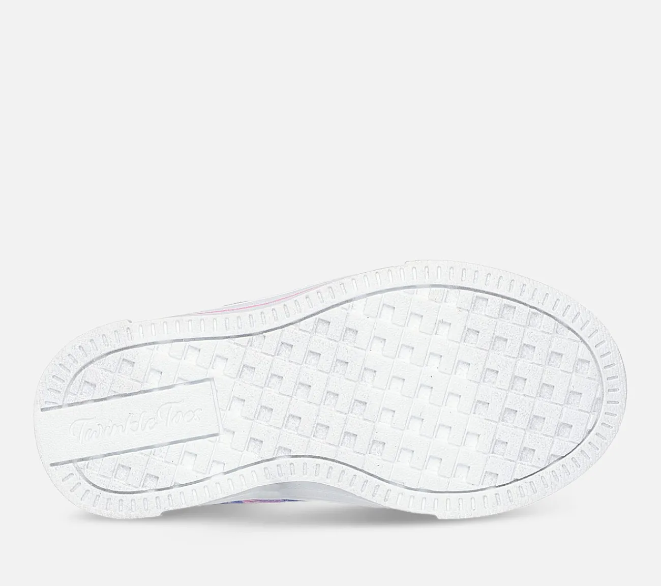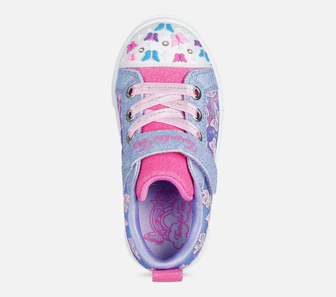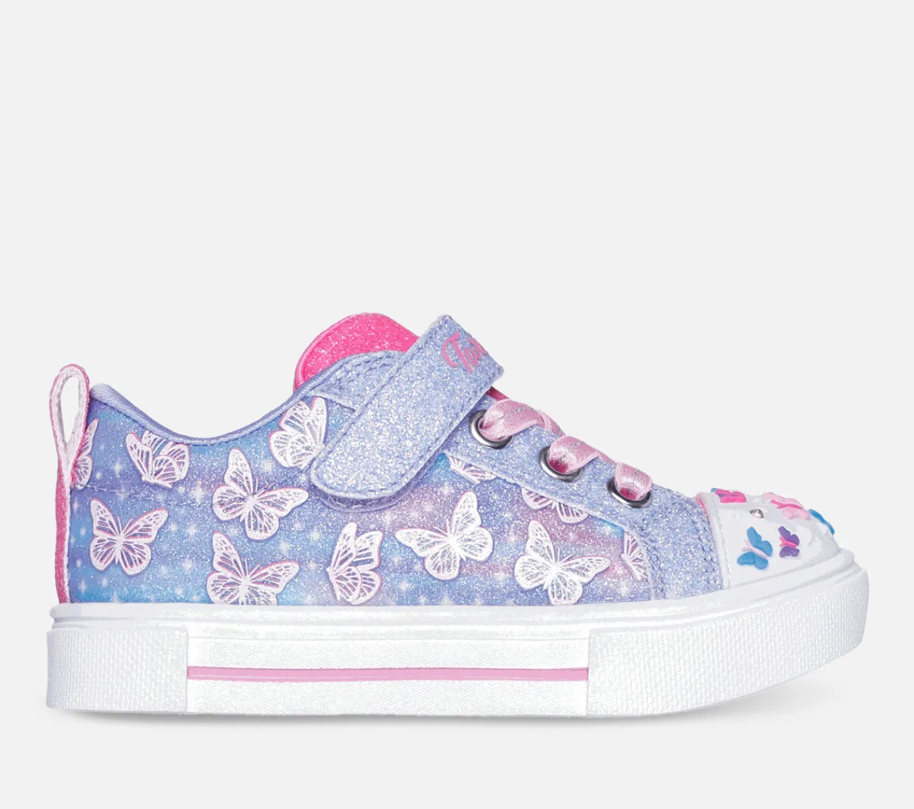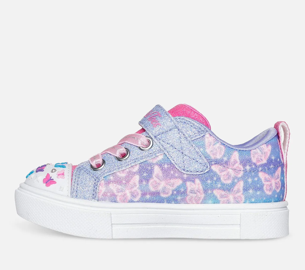 Flyv op i magisk stil med Skechers Twinkle Toes: Twinkle Sparks – Ombre Flutter. Denne glitrende blinkesko har en syntetisk overdel med regnbueprint og sommerfugle, elastiske snørebånd, justerbar rem over vristen og en tåspids pyntet med sommerfugle.