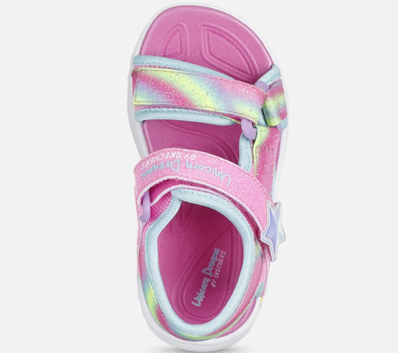 Oplys deres skridt med lidt enhjørningemagi i Skechers Unicorn Dreams Sandal – Dreamy Unicorns. Dette lysende design har en glitrende vævet stropoverdel med Skechers’ adaptive lukning, samt en skulptureret enhjørningemellemsål.