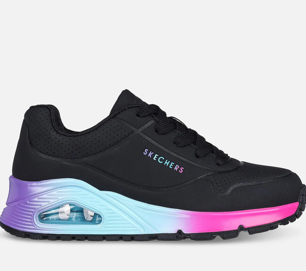 Løft din stil med Skechers Street Uno Gen1 – Pop of Ombre. Denne modesneaker har en syntetisk Durabuck-overdel med en ombre-farvet mellemsål, en Skechers Air-Cooled Memory Foam komfort indersål og en synlig Skech-Air airbag mellemsål.