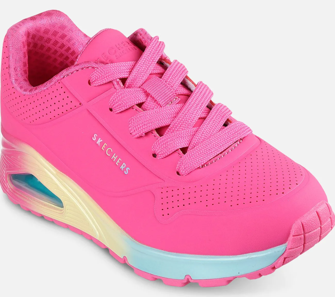 Løft din stil med Skechers Street Uno Gen1 – Pop of Ombre. Denne modesneaker har en syntetisk Durabuck-overdel med en ombre-farvet mellemsål, en Skechers Air-Cooled Memory Foam komfort indersål og en synlig Skech-Air airbag mellemsål.