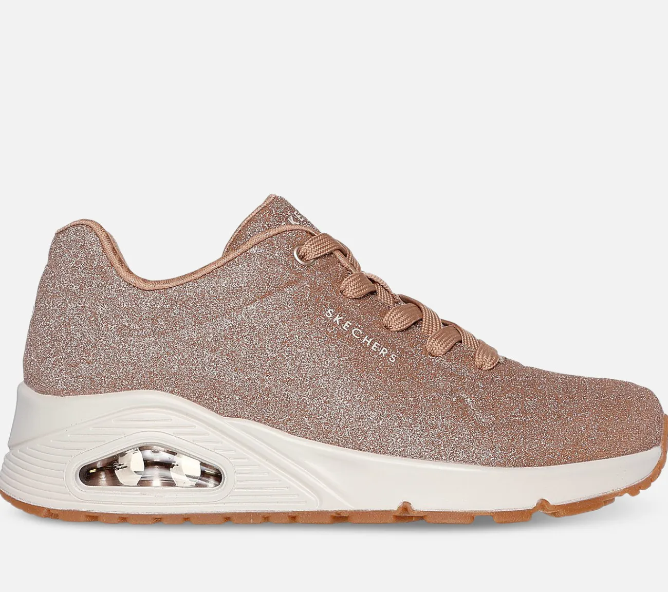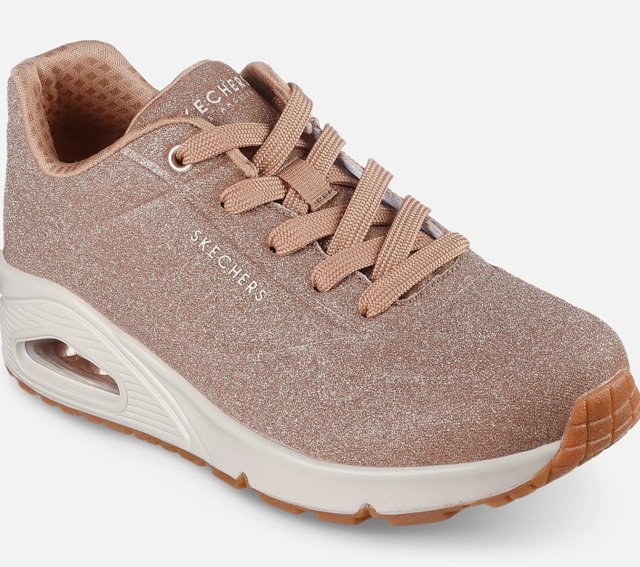 Strål og glitre dagen lang i komfort med Skechers Street Uno – Glitter Bomb. Denne modesneaker har en overdel i syntetisk glimmer med en Skechers Air-Cooled Memory Foam indersål og en synlig Skech-Air mellemsål.