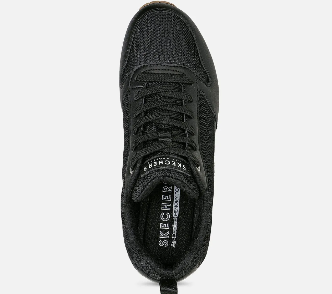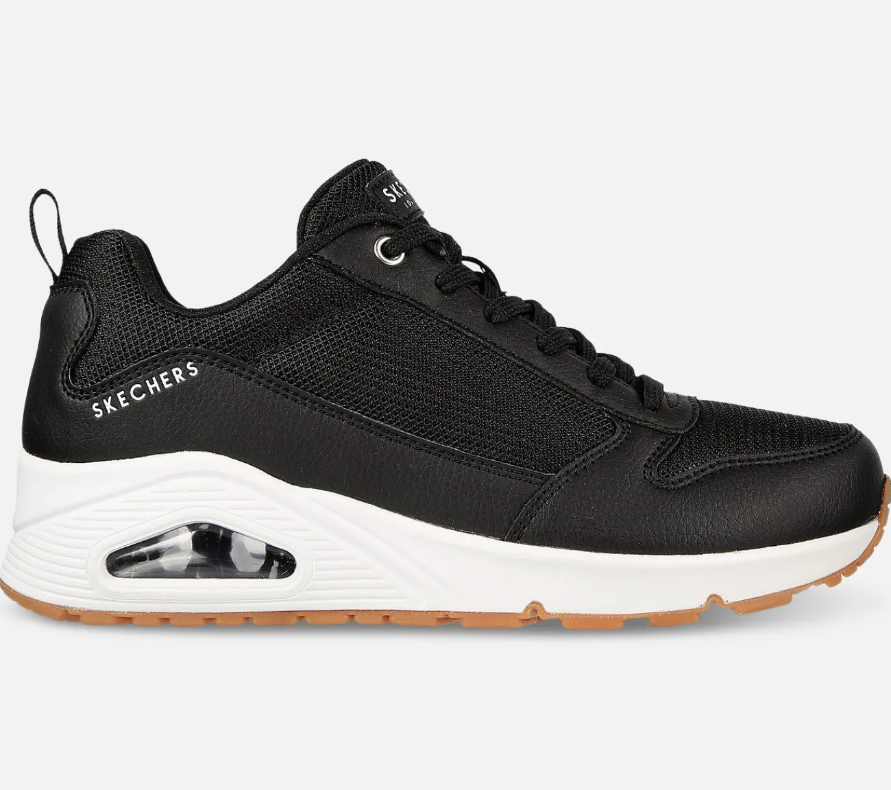 Ren, raffineret sneaker-stil kombineres med komfort i Skechers Uno – Inside Matters. Glat syntetisk og mesh stof overdel i en klassisk jogger-stil sko med snørebånd, syninger og overlay detaljer. Air Cooled Memory Foam indersål og synlig Skech-air airbag mellemsål.