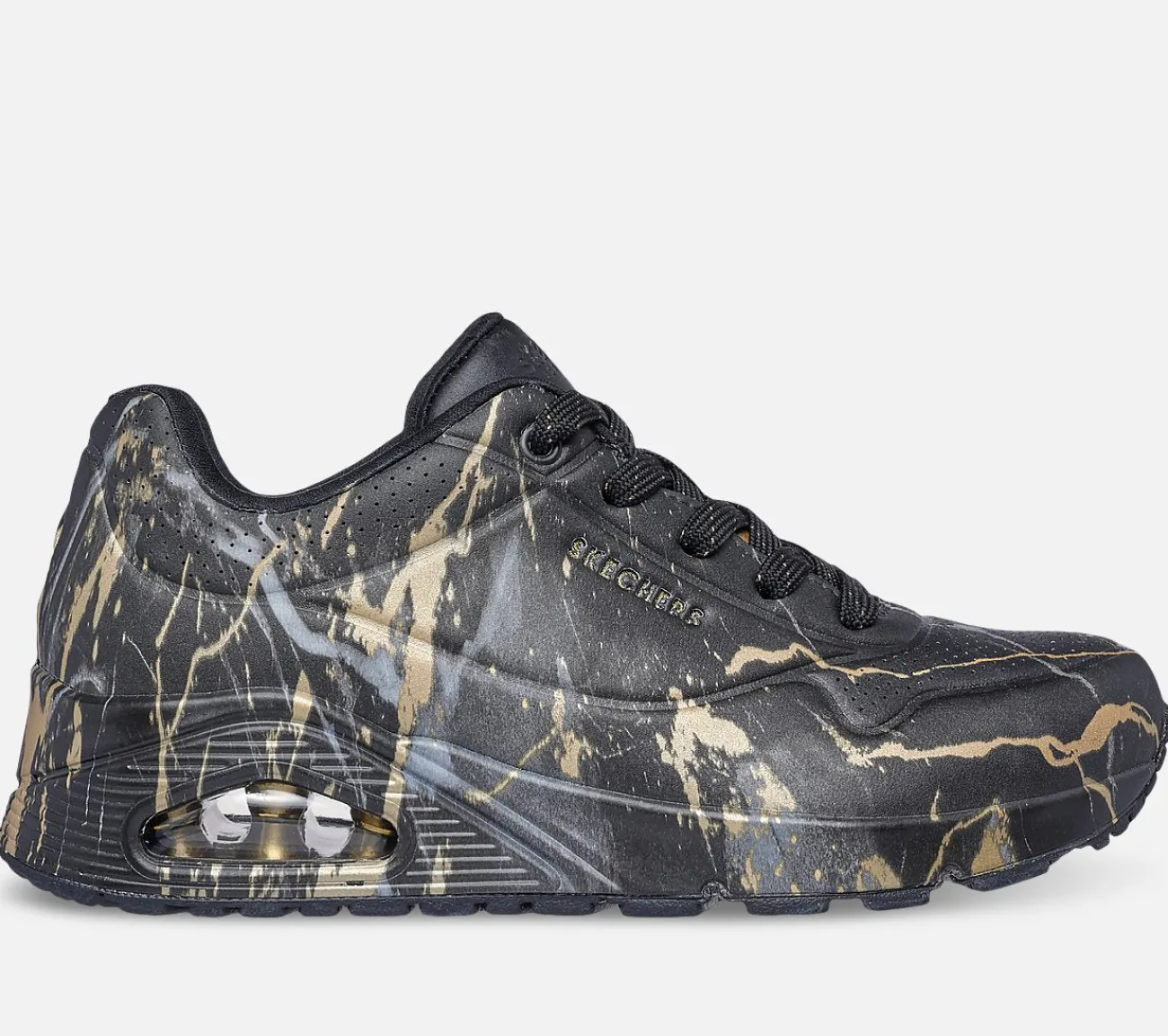 Vælg et solidt valg inden for mode og komfort med Skechers Street™ Uno – Marble Marvel. Denne snørebåndssneaker har et marmormønstret duraleather-overdel og en marmormønstret mellemsål med en Skechers Air-Cooled Memory Foam® indersål og en Skech-Air® synlig luftpude-mellemsål.