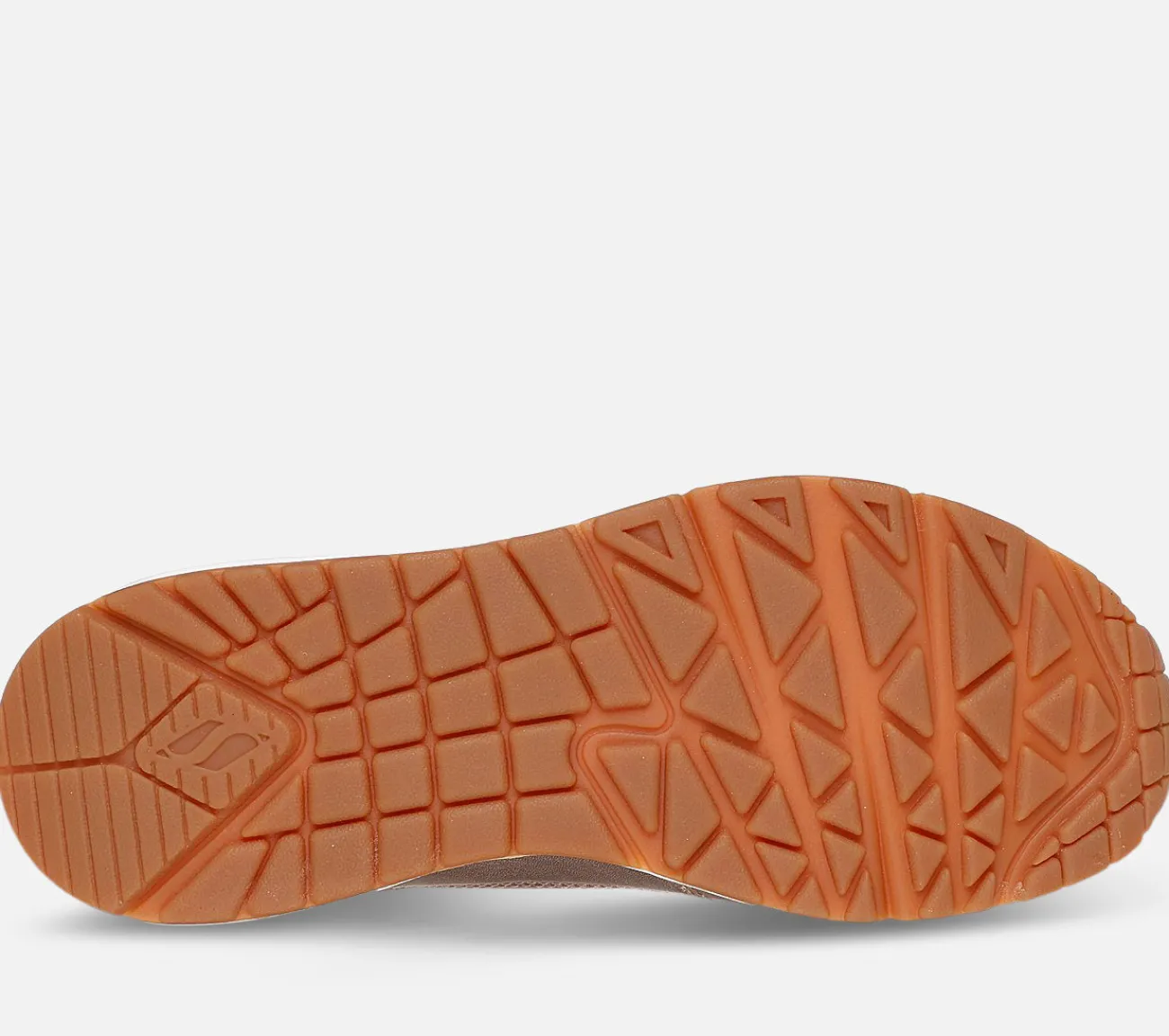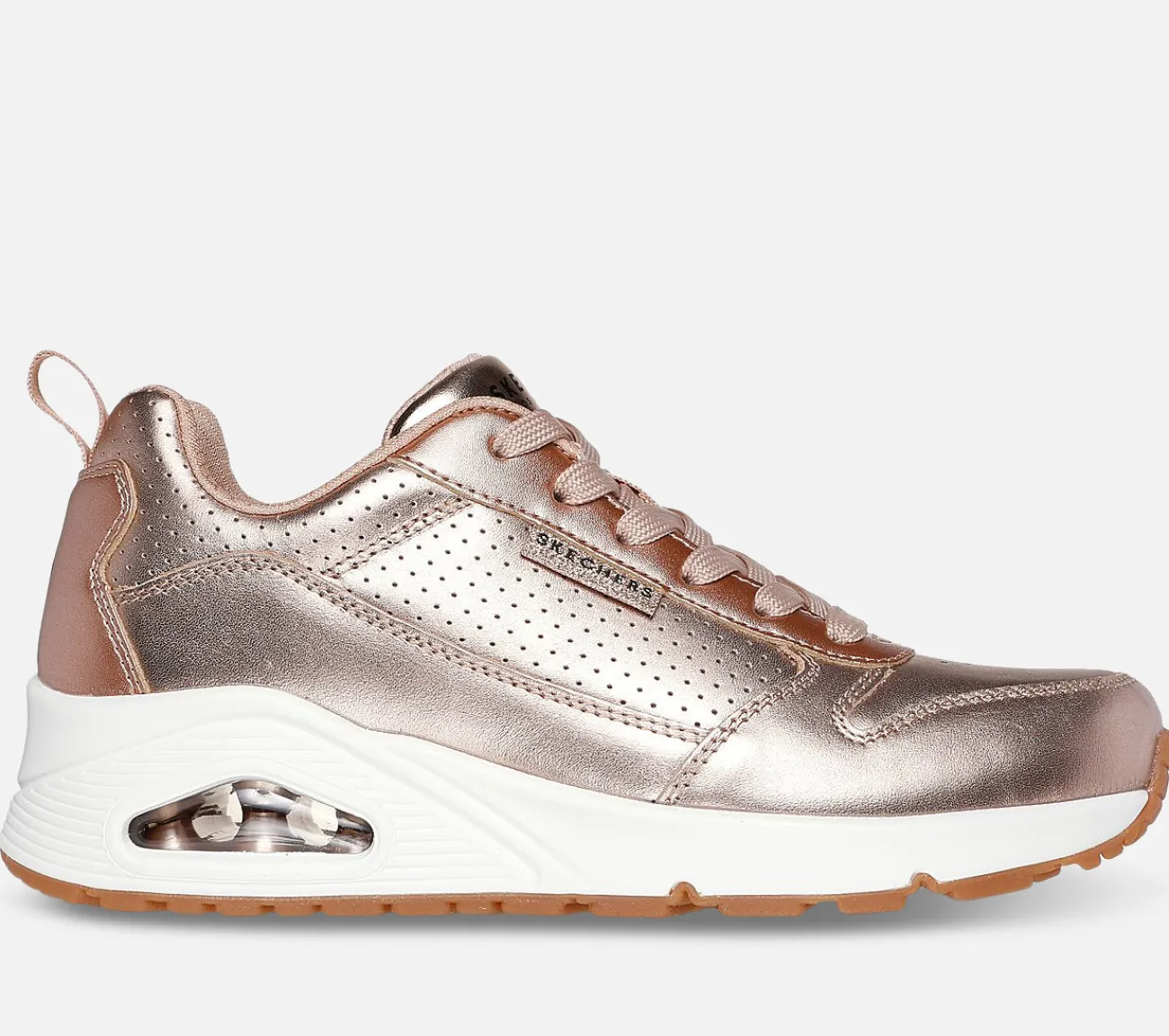 Strål i moderigtig komfort med Skechers Street Uno – Metallixs. Denne sneaker med snørebånd har en overdel i læder med en metallisk finish, en Skechers Air-Cooled Memory Foam indersål og en Skech-Air synlig mellemsål.