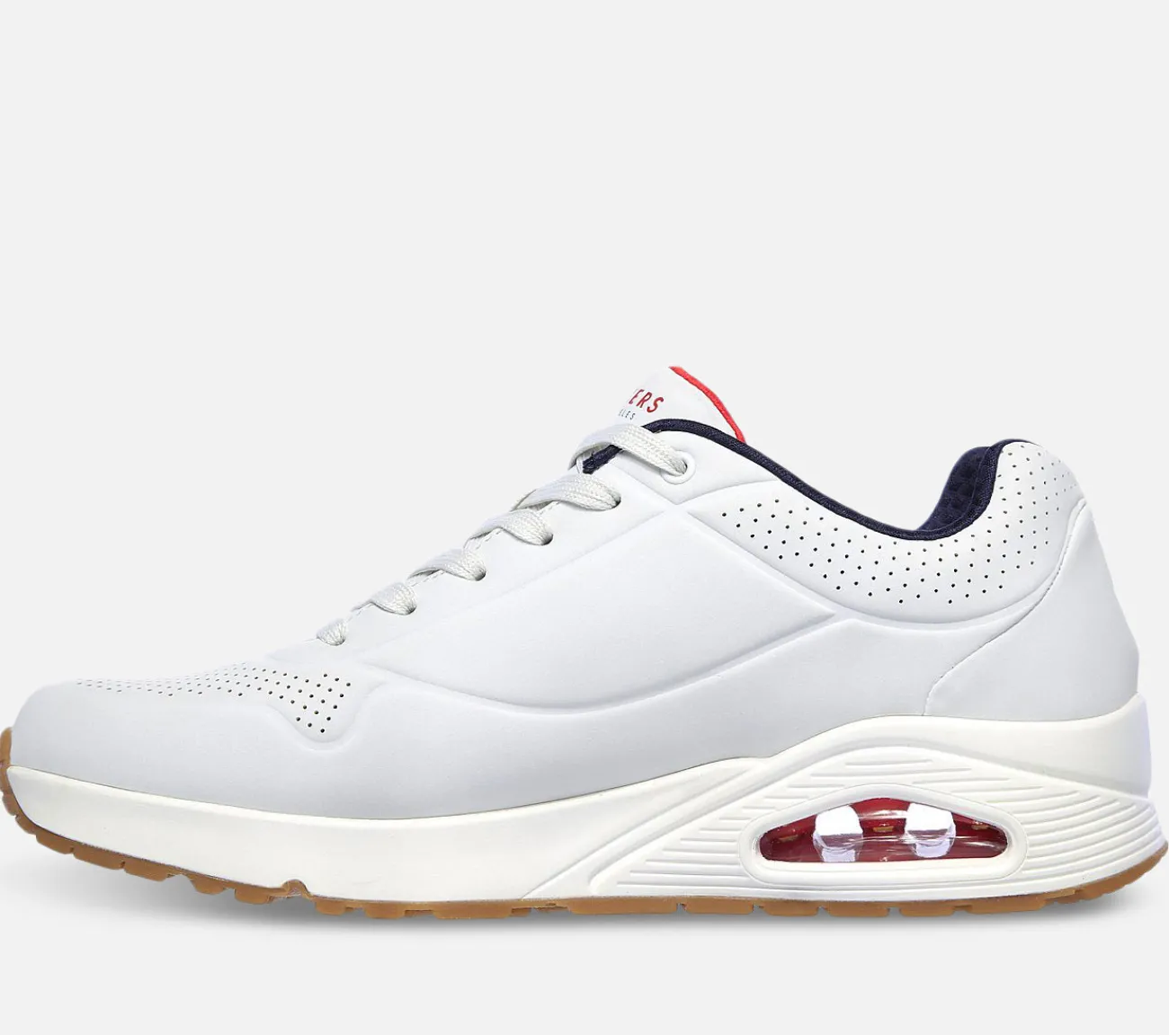 Her får du trendy stil og støddæmpende komfort med Street Uno – Stand on Air. Med en synlig Skech-Air mellemsål får du støddæmpning og stor støtte. Med denne lækre sko fra Uno kollektionen får du en Air-Cooled Memory Foam der giver dig en unik pasform og blød fornemmelse hele dagen. En perfekt sneaker til hverdagsbrug eller til jobbet.
