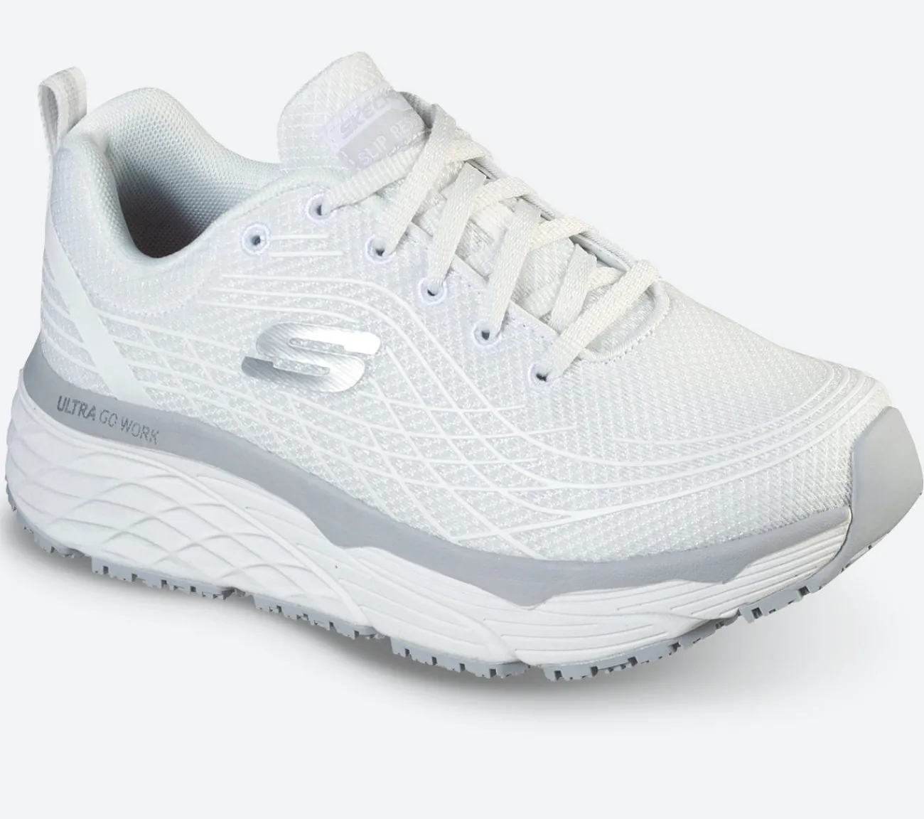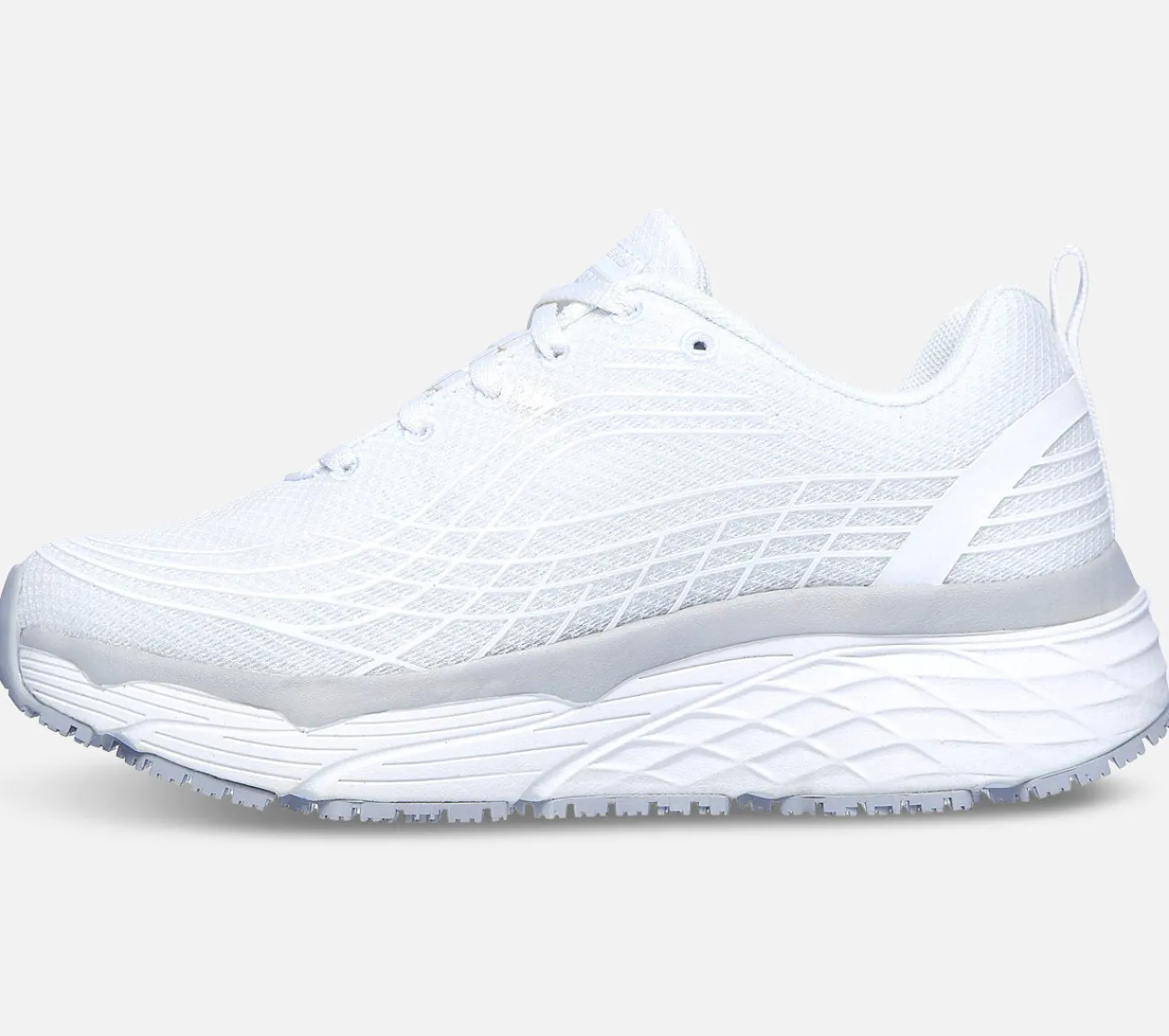 Skechers Max Cushioning Elite SR er en skridhæmmende arbejdssko. Denne arbejdssko er ekstra stødabsorberende og er perfekt, til dig som går og står meget i løbet af arbejdsdagen. Hælen er ekstra polstret, for øget komfort og stabilitet. Overdelen er af mesh tekstil, som giver foden mulighed for at ånde. Indersålen er en åndbar Memory Foam sål, som former sig efter fodens pasform og aflaster ømme fødder. Ydersålen er skridtestet og godkendt efter højest opnåelige godkendelser.